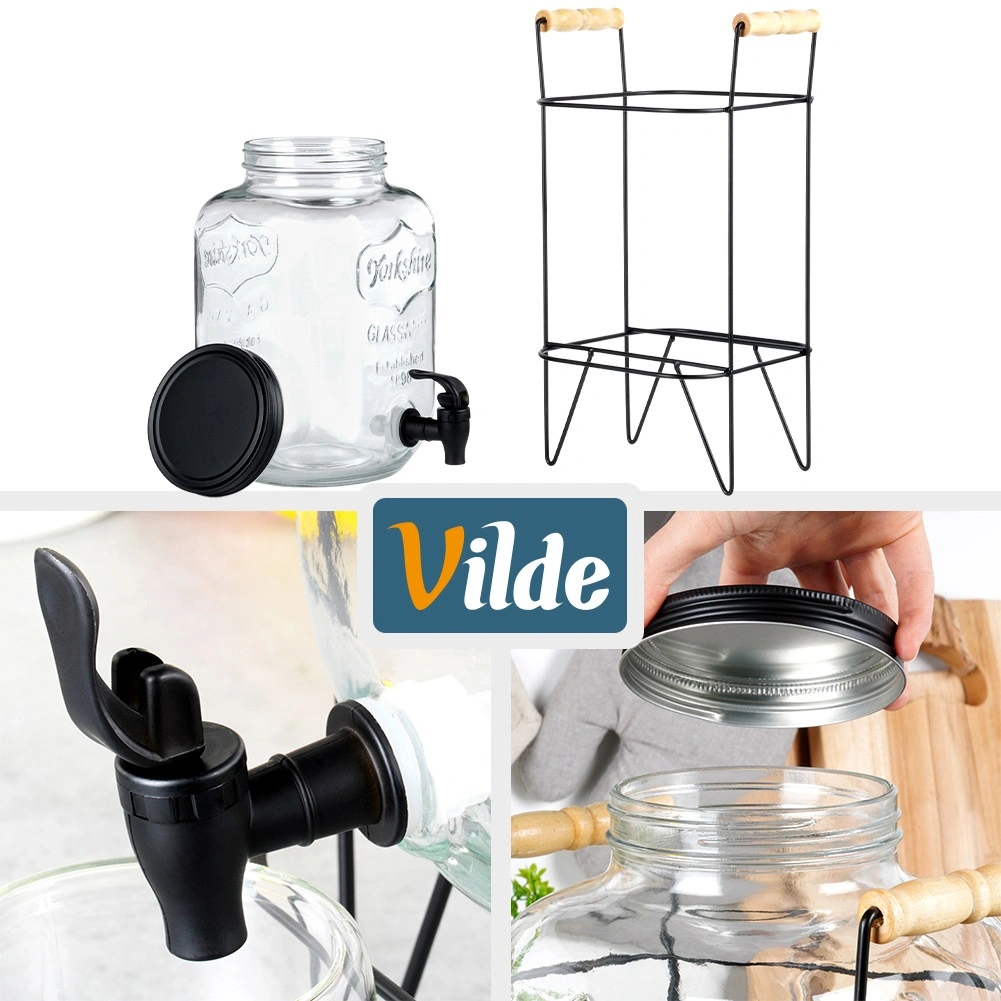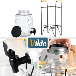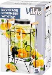 Skleněná nádoba je vyrobena z kvalitního silného skla s dekorativním ražením. Stojan i víčko jsou z kovu v černé barvě, madla ze dřeva a kohoutek z odolného plastu. Dispenser je vhodný pro vodu s ovocem, limonády, ledový čaj i nápoje s kostkami ledu. Není určen pro horké nápoje.