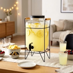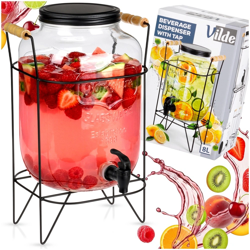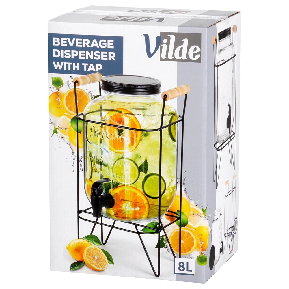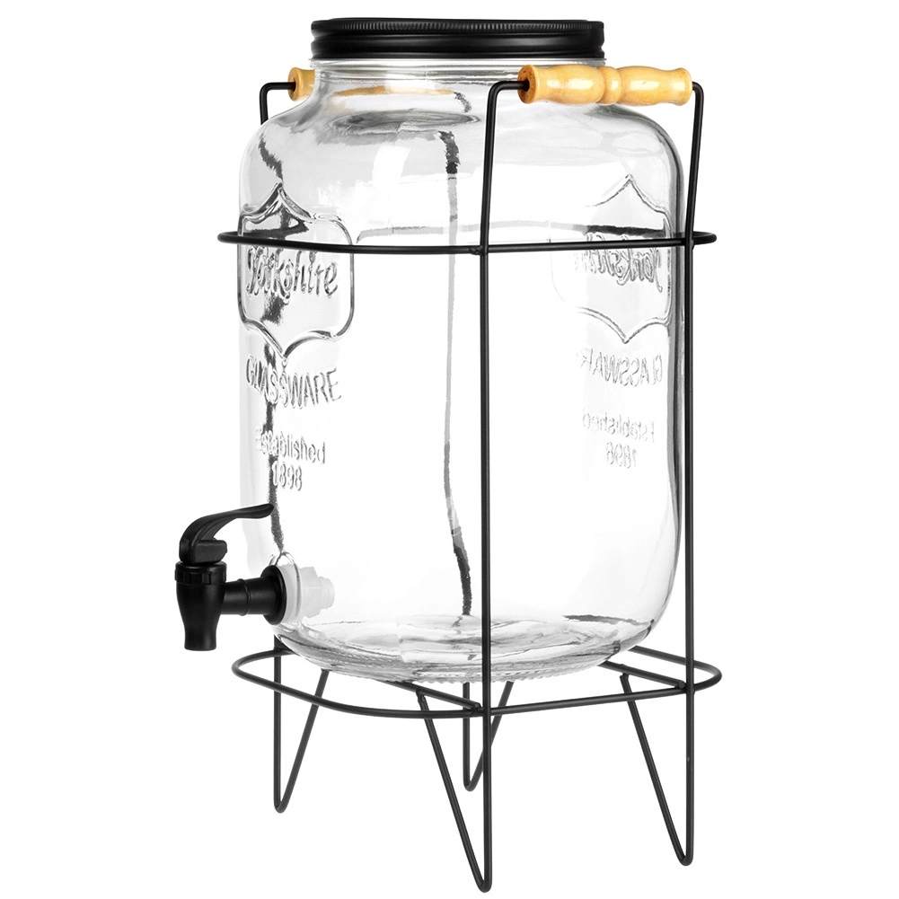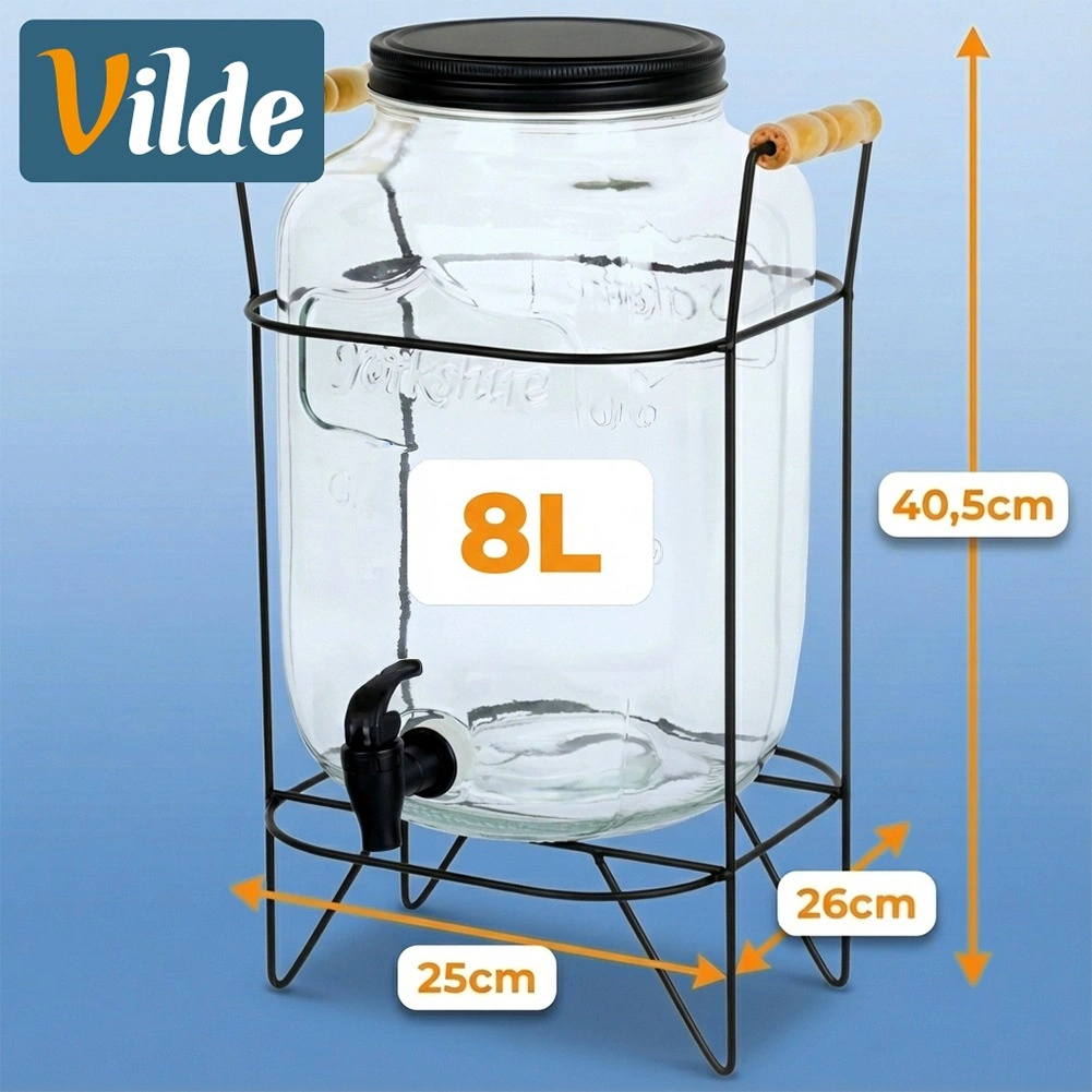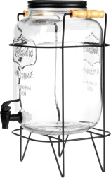 Elegantní skleněný nápojový dispenser 8 l se stabilním kovovým stojanem a pohodlným kohoutkem pro snadné nalévání. Vyroben z silného skla s efektním reliéfem, má šroubovací kovové víčko a stojan s dřevěnými úchyty. Ideální pro limonádu, vodu, ledový čaj i punč na zahradní party i do domácnosti.