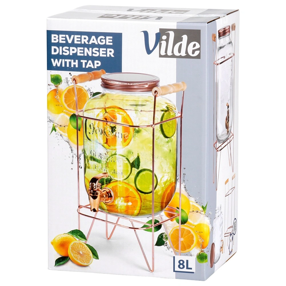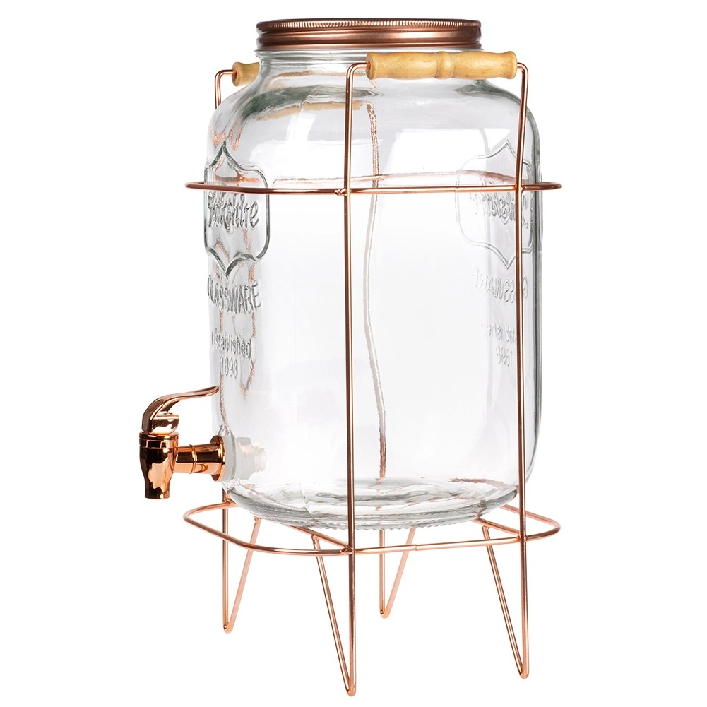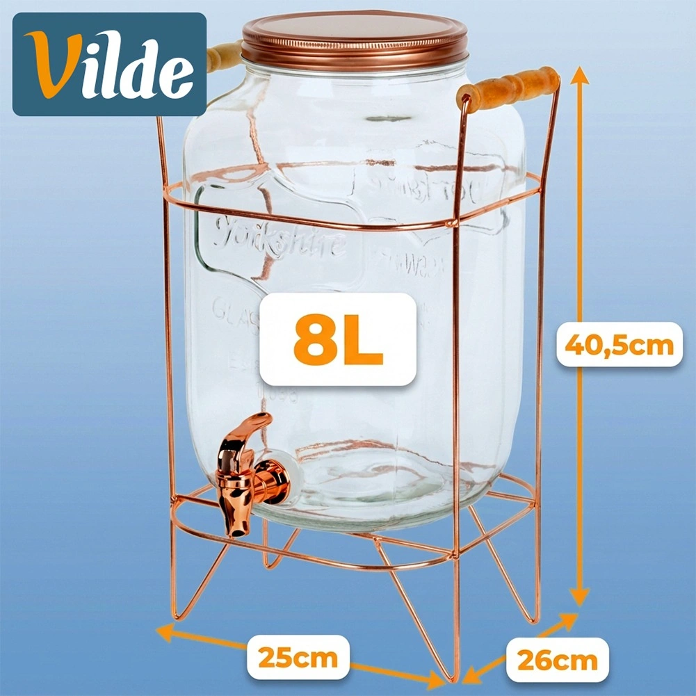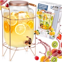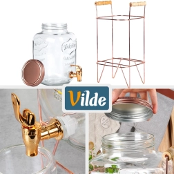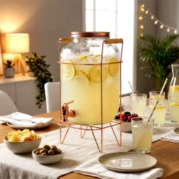 Set obsahuje skleněný džbán/dávkovač, kovový stojan a kovové šroubovací víko v barvě růžového zlata. Vhodné pro vodu, domácí limonády, ochucené vody, džusy, ledové čaje i punče. Skvěle se hodí na zahradu, terasu i do interiéru.