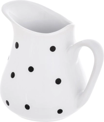 Stylový keramický džbánek o objemu 480 ml v bílé barvě s černými puntíky je ideální pro každodenní servírování. Nabízí univerzální využití na vodu, limonádu, víno, mléko, smetanu či omáčky, má ergonomické ucho a širokou výlevku pro přesné nalévání bez cákání. Je vhodný do myčky i mikrovlnky a díky dekorativnímu designu skvěle vynikne na každém stole.