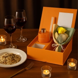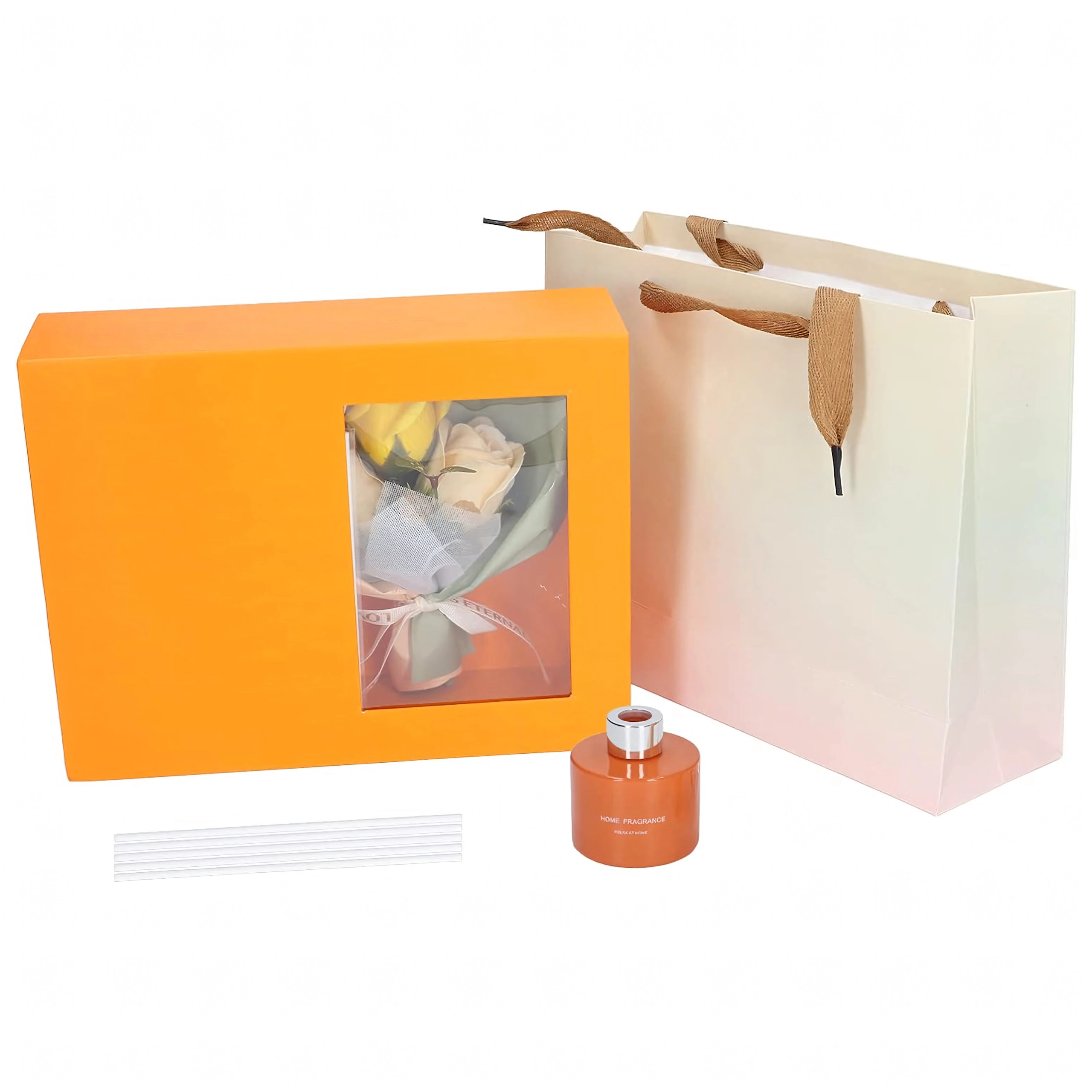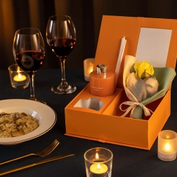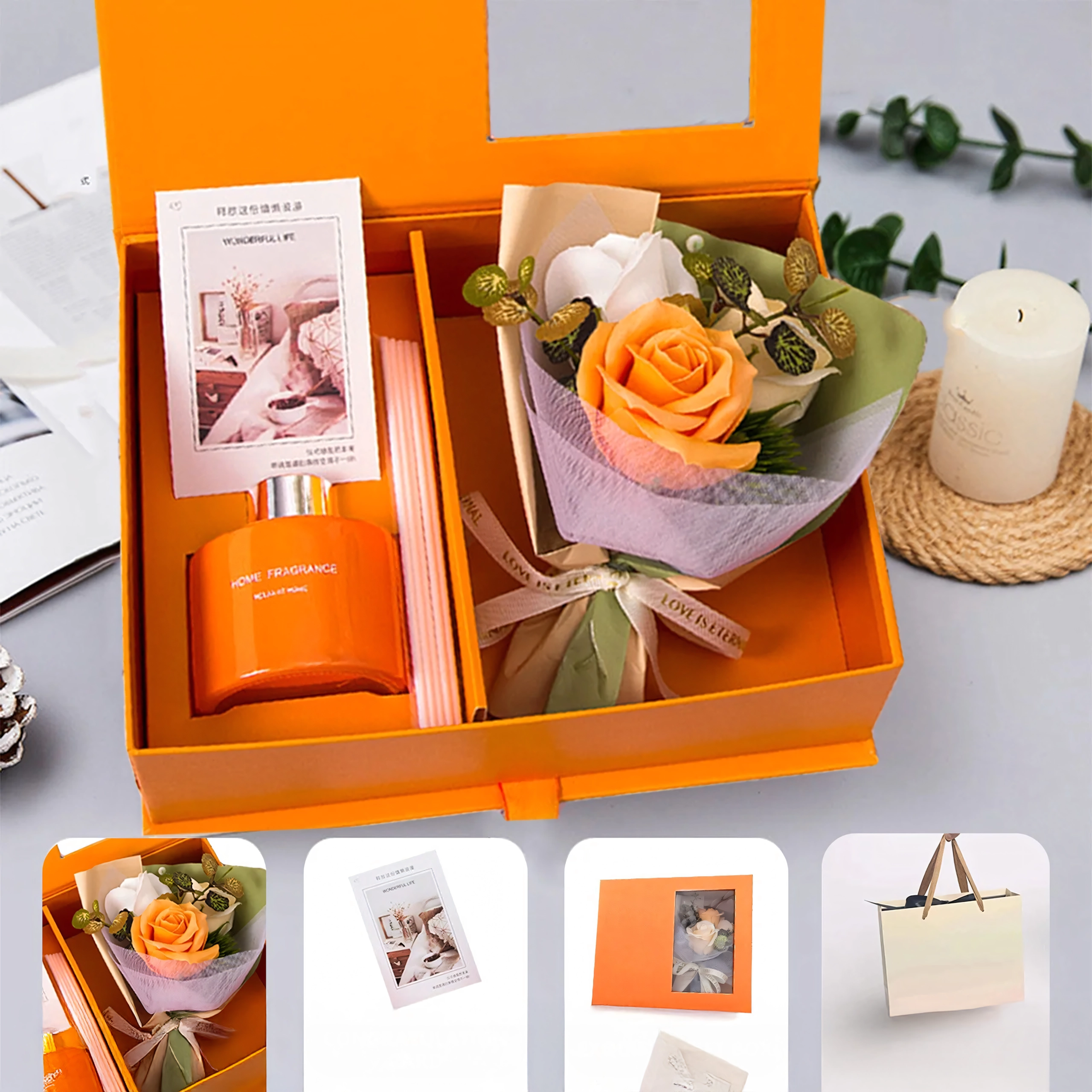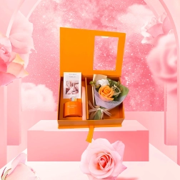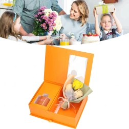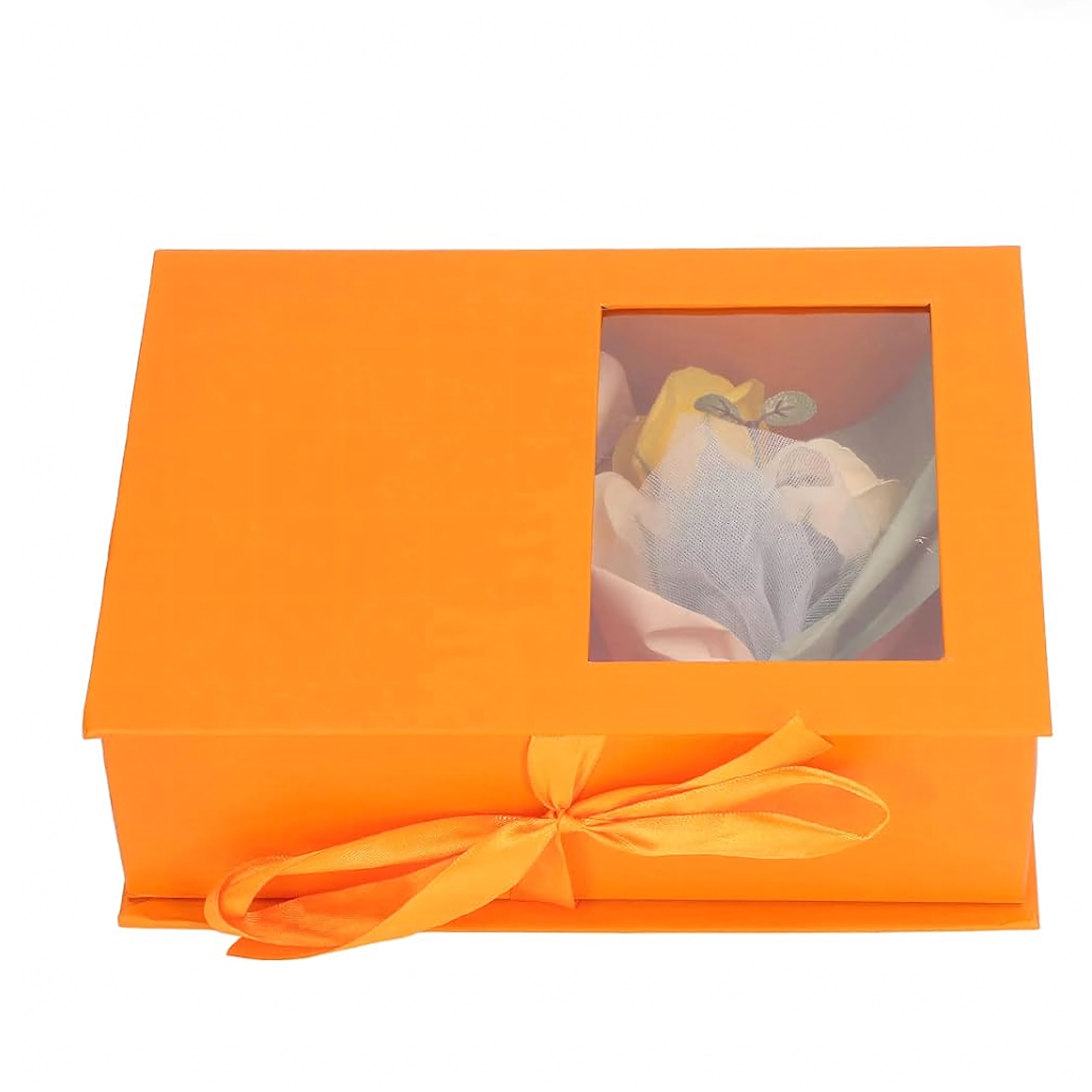 Pevná oranžová krabička s okénkem a mašlí působí reprezentativně, součástí je malá kytice dekorativních růží pro dokonale sladěný vzhled dárku.