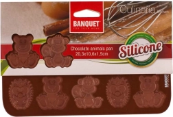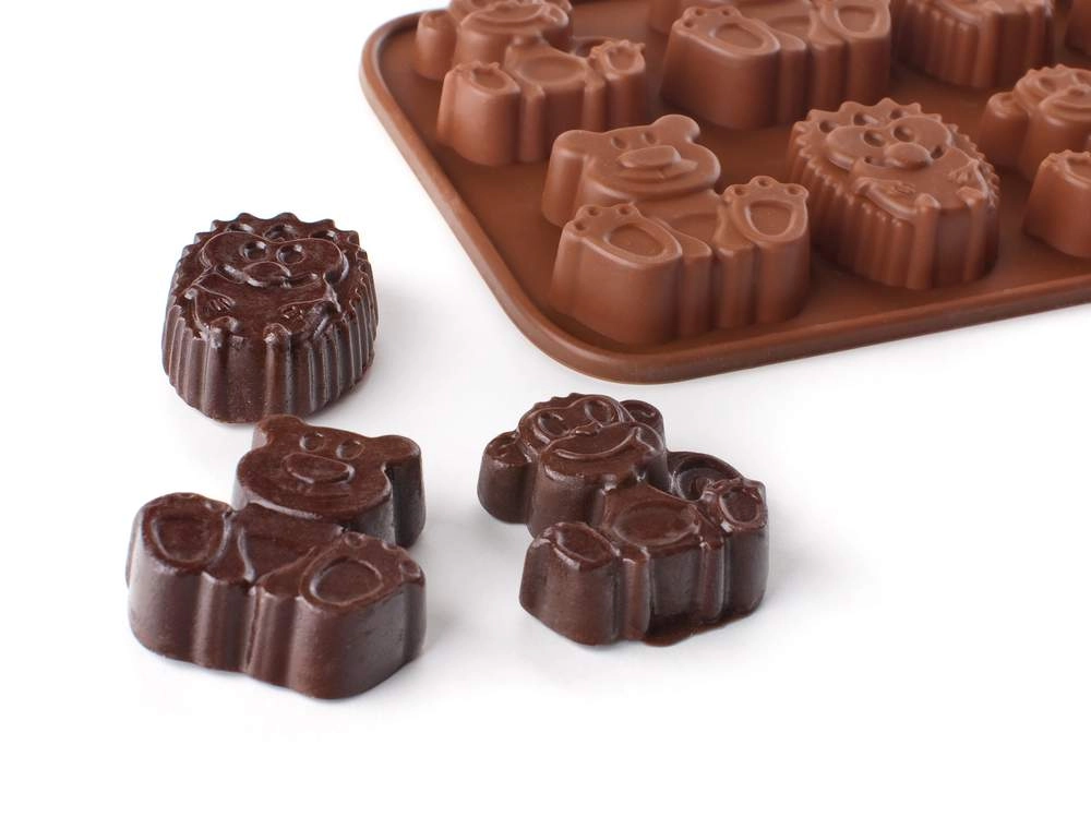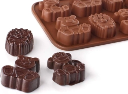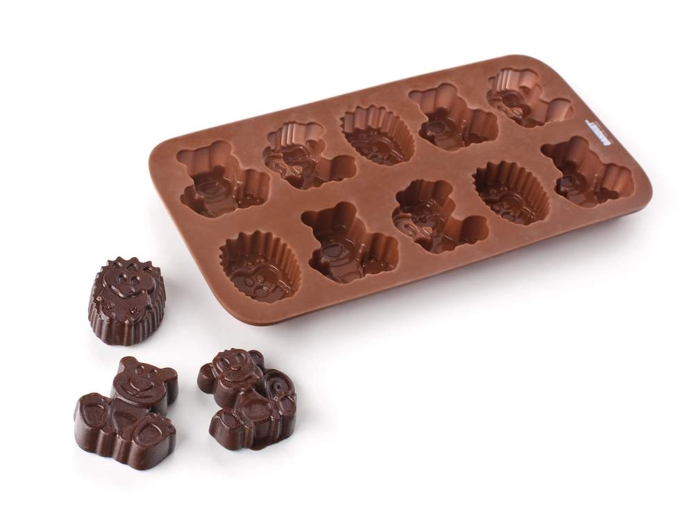 Tato hnědá silikonová forma se zvířecími motivy je ideální pro výrobu domácí čokolády, pralinek, karamelek i ledových kostek. Díky pružnému silikonu se hotové kousky snadno vyklápějí bez lámání a forma si zachovává tvar i při častém používání.