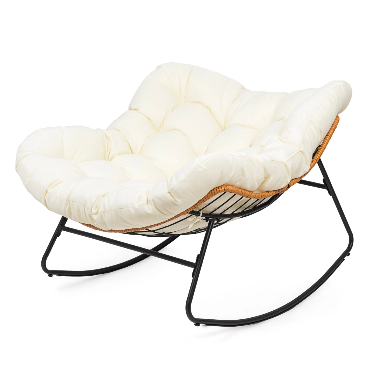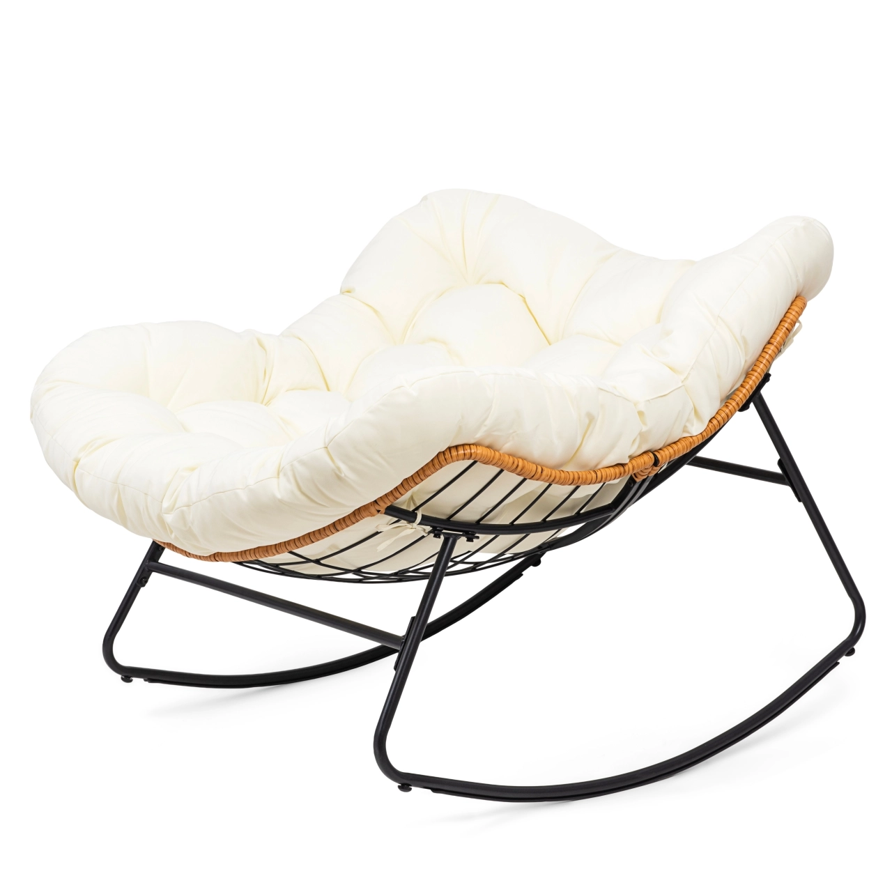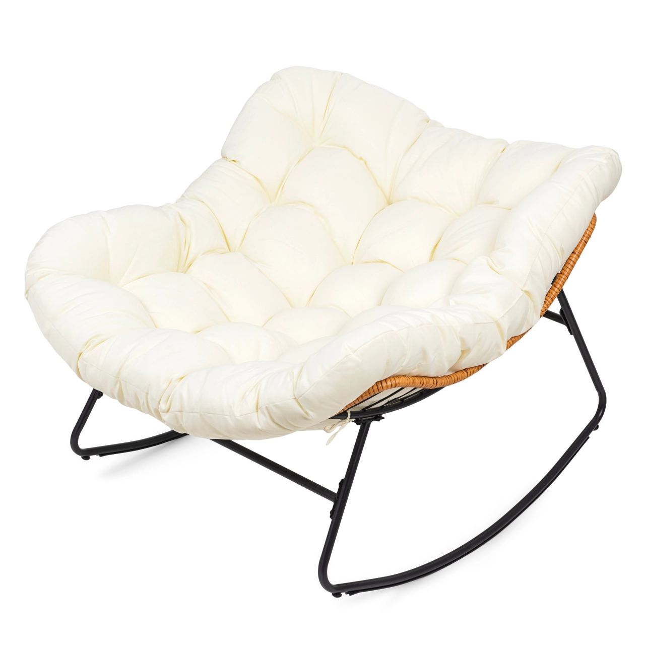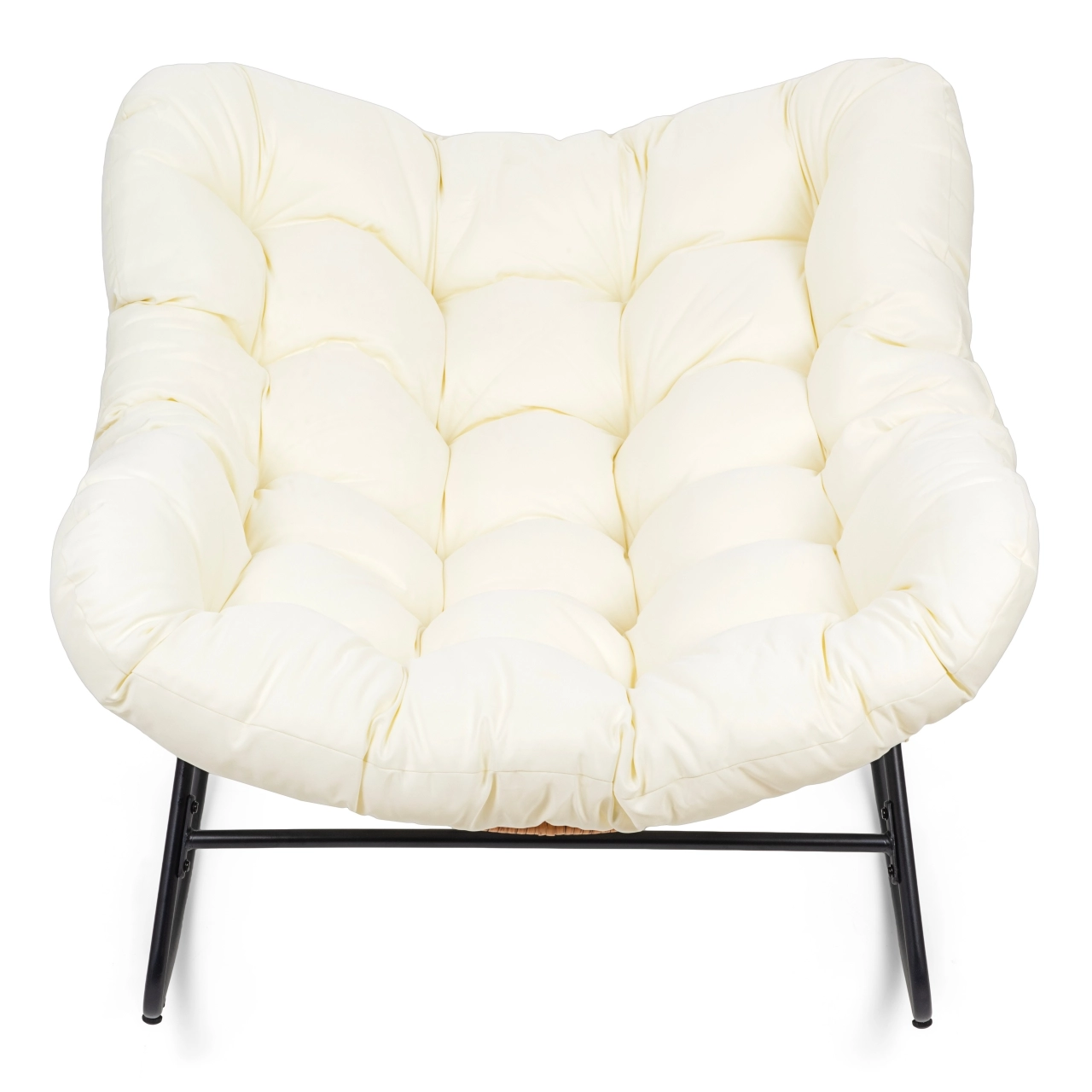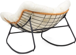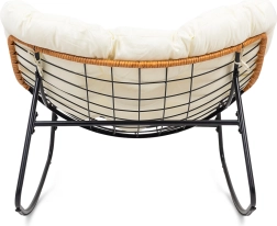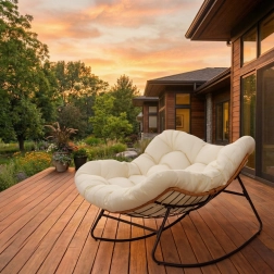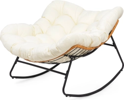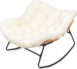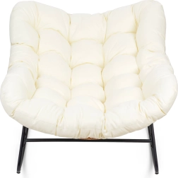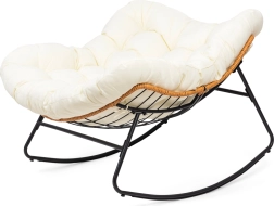 Toto moderní houpací křeslo vyniká širokým a hlubokým „egg“ sedákem, který vás jemně obejme a uvolní po dlouhém dni. Silný prošívaný polštář drží tvar, přitom je příjemně pružný, zatímco profilované lyžiny zajišťují plynulý a kontrolovaný pohyb.