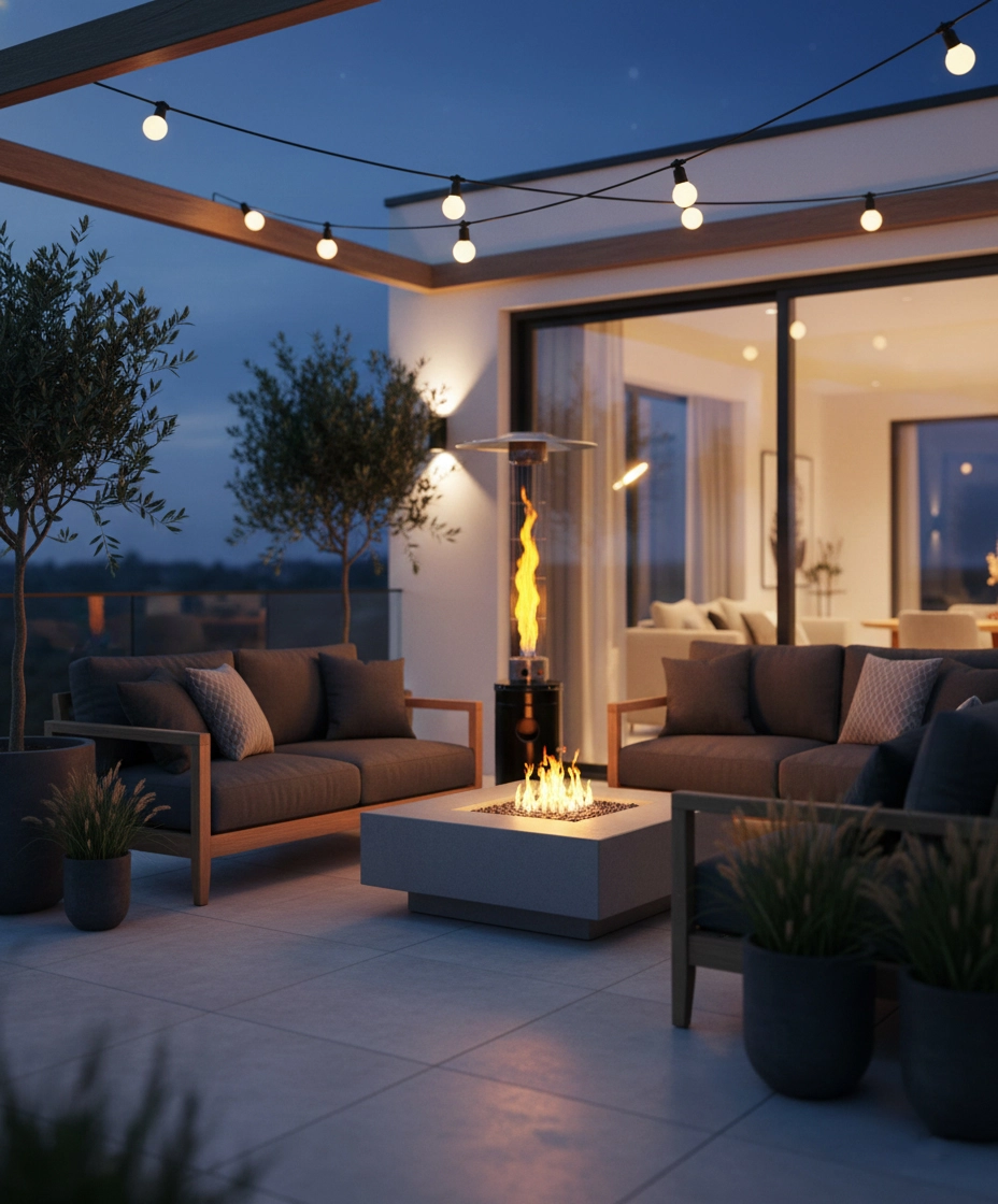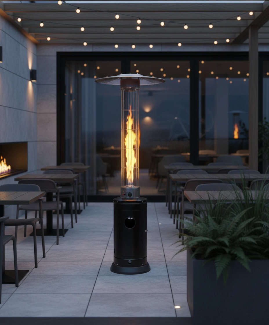 Široký rozsah výkonu umožňuje přizpůsobit intenzitu ohřevu velikosti prostoru i venkovní teplotě — od intimních večerů po náročnější provoz.