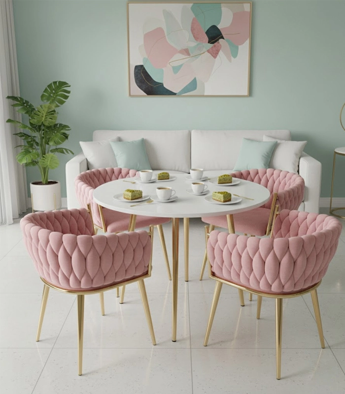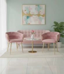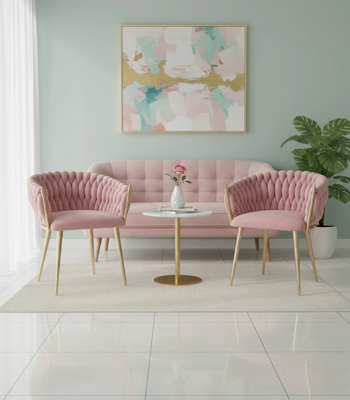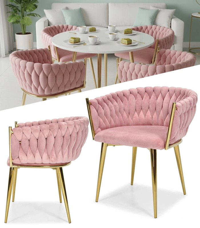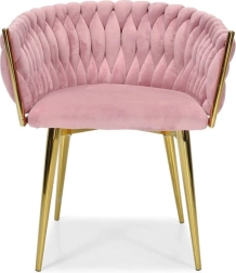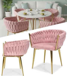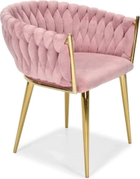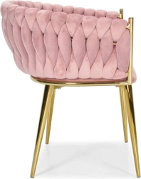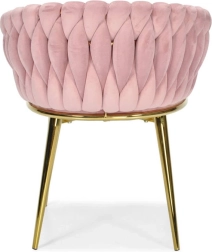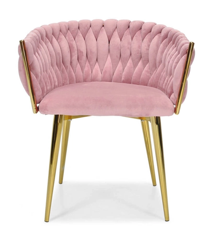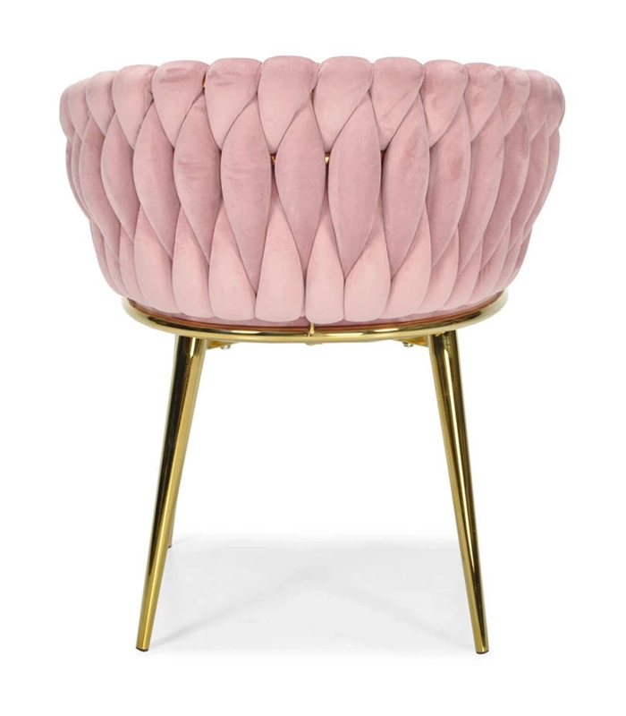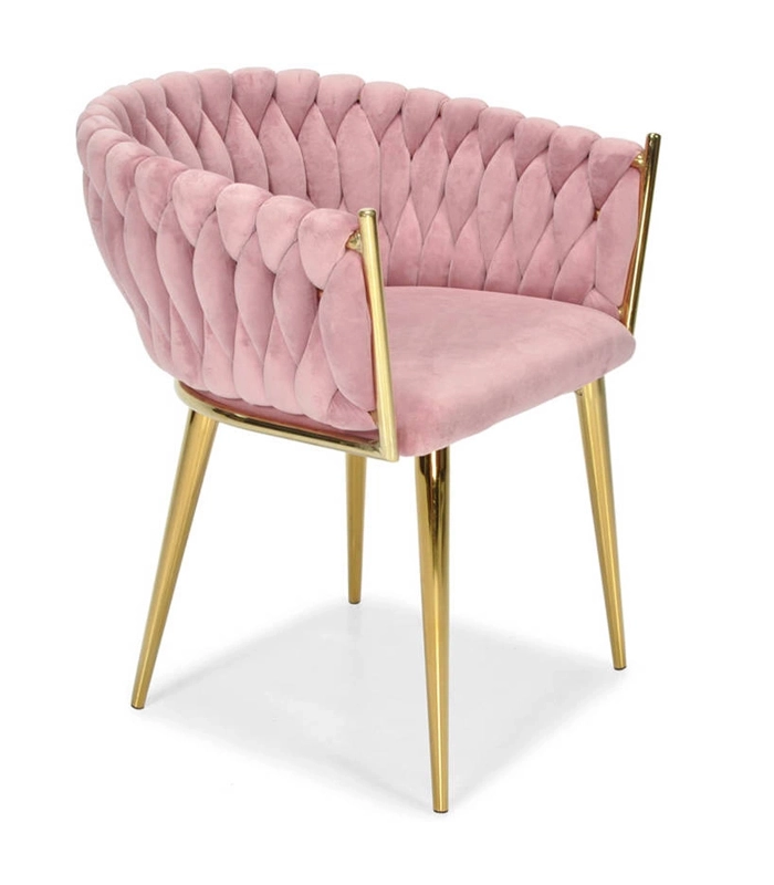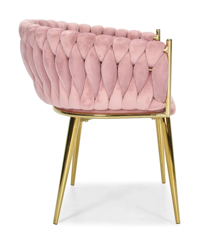 Tato designová židle je skutečným šperkem interiéru. Pletené velurové čalounění vytváří efektní 3D strukturu, která okamžitě upoutá pozornost a působí mimořádně sofistikovaně. Pudrově růžová barva je decentní, a přesto výrazná – ideální do moderních i glamour aranžmá.