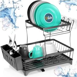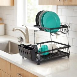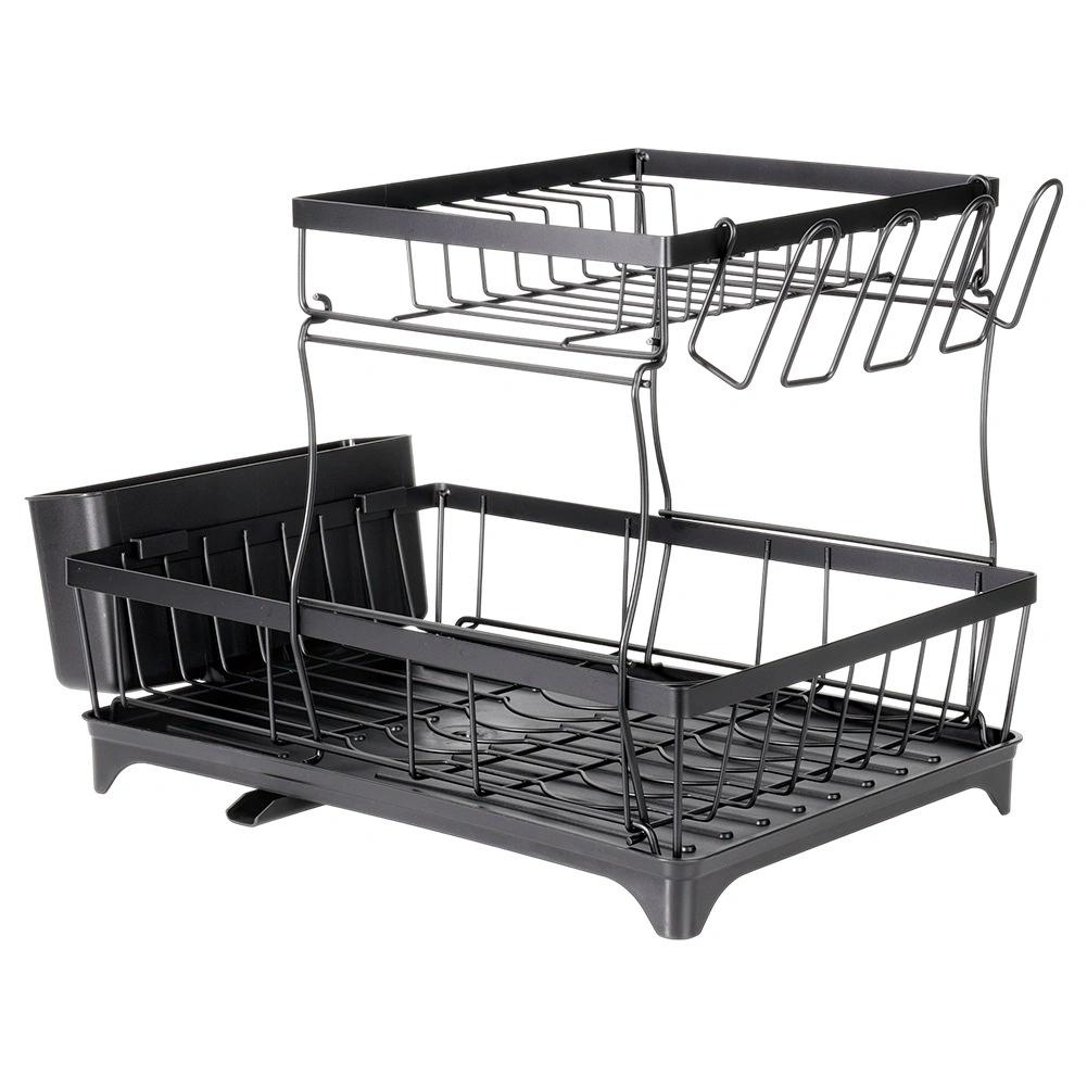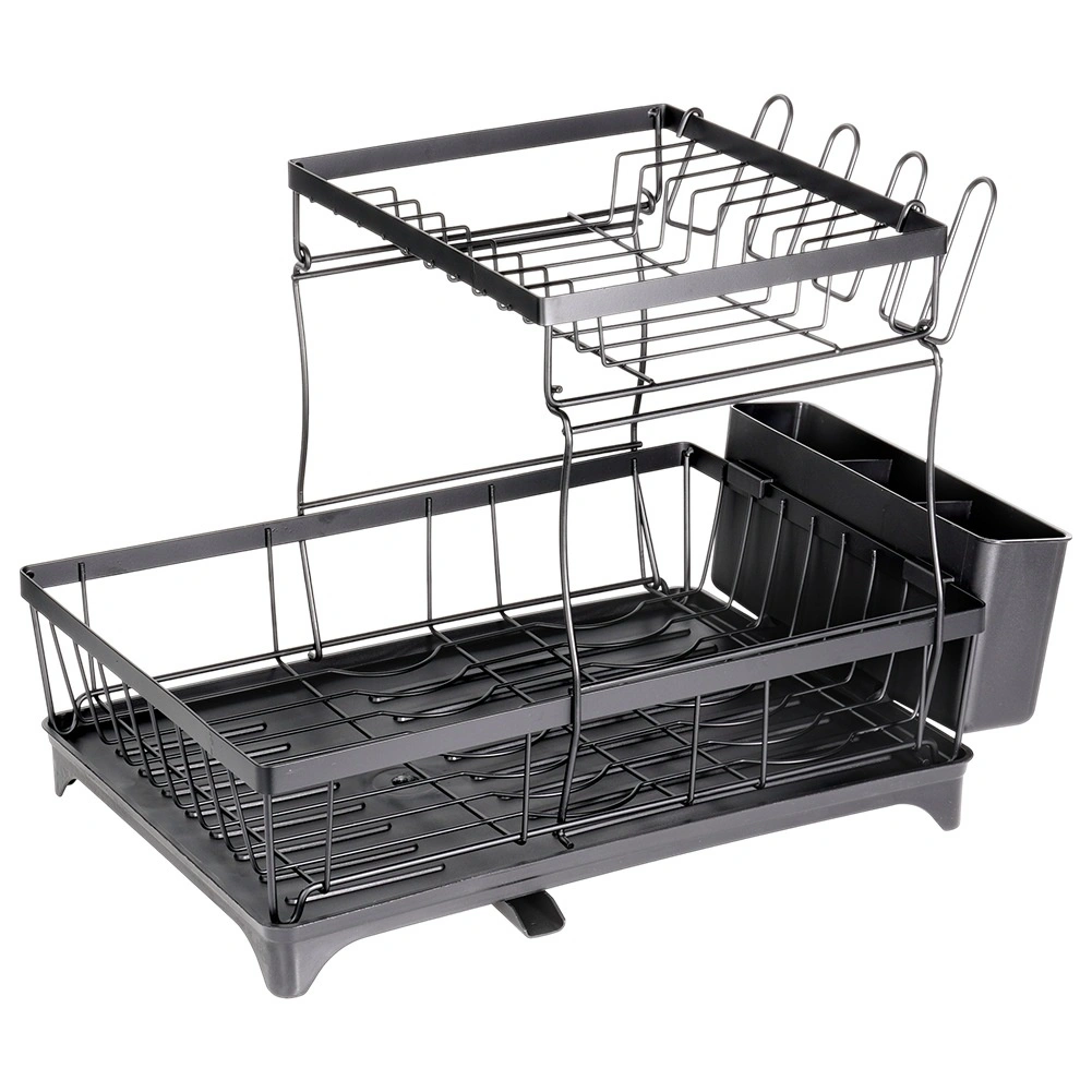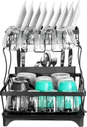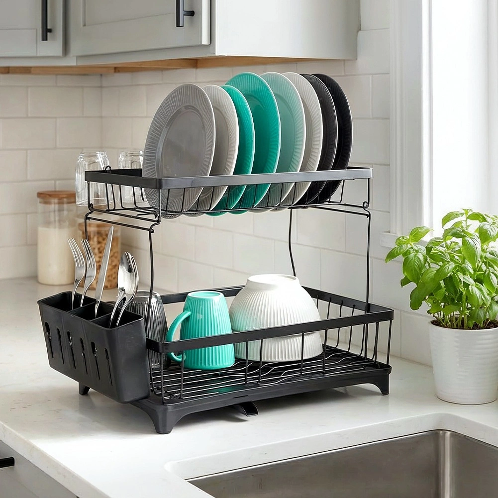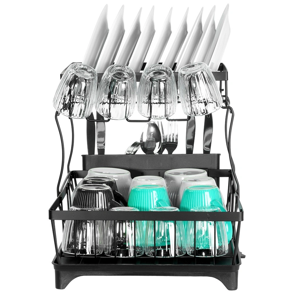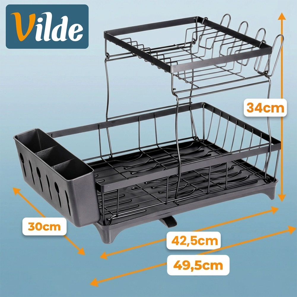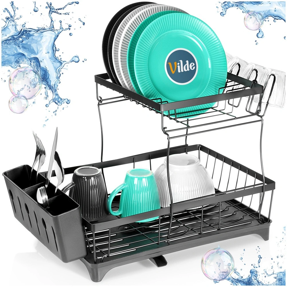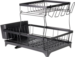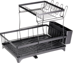 Dvouúrovňový odkapávač na nádobí v elegantní černé barvě nabízí velkou kapacitu, pevnou kovovou konstrukci a praktickou odkapávací tácu s výlevkou. Uspořádá talíře, misky, sklenice i příbory a zároveň chrání kuchyňskou desku před vodou.
