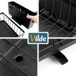 Kovová konstrukce v matně černé barvě je odolná a snadná na údržbu, spodní plastová odkapávací tác s integrovanou výlevkou odvádí vodu kontrolovaně přímo do dřezu a pomáhá udržet kuchyň v suchu a čistotě. Moderní industriální design se hodí do moderních i klasických kuchyní.