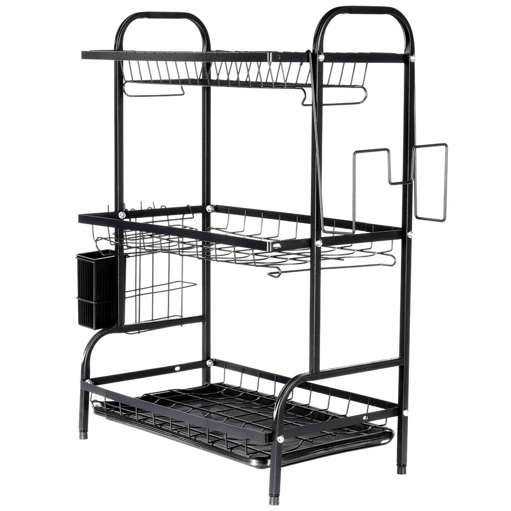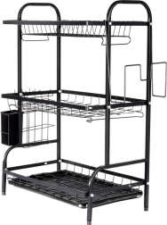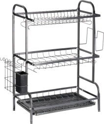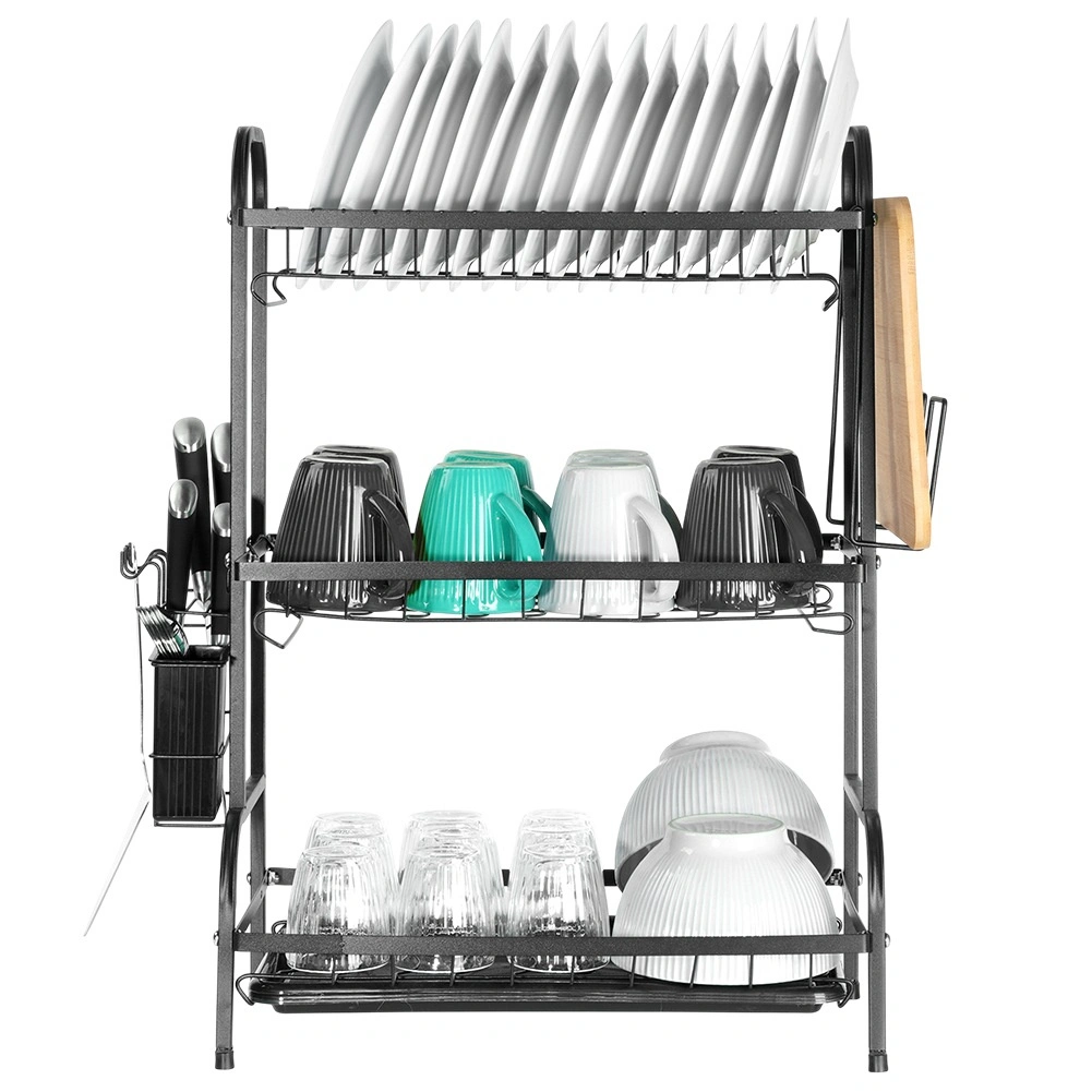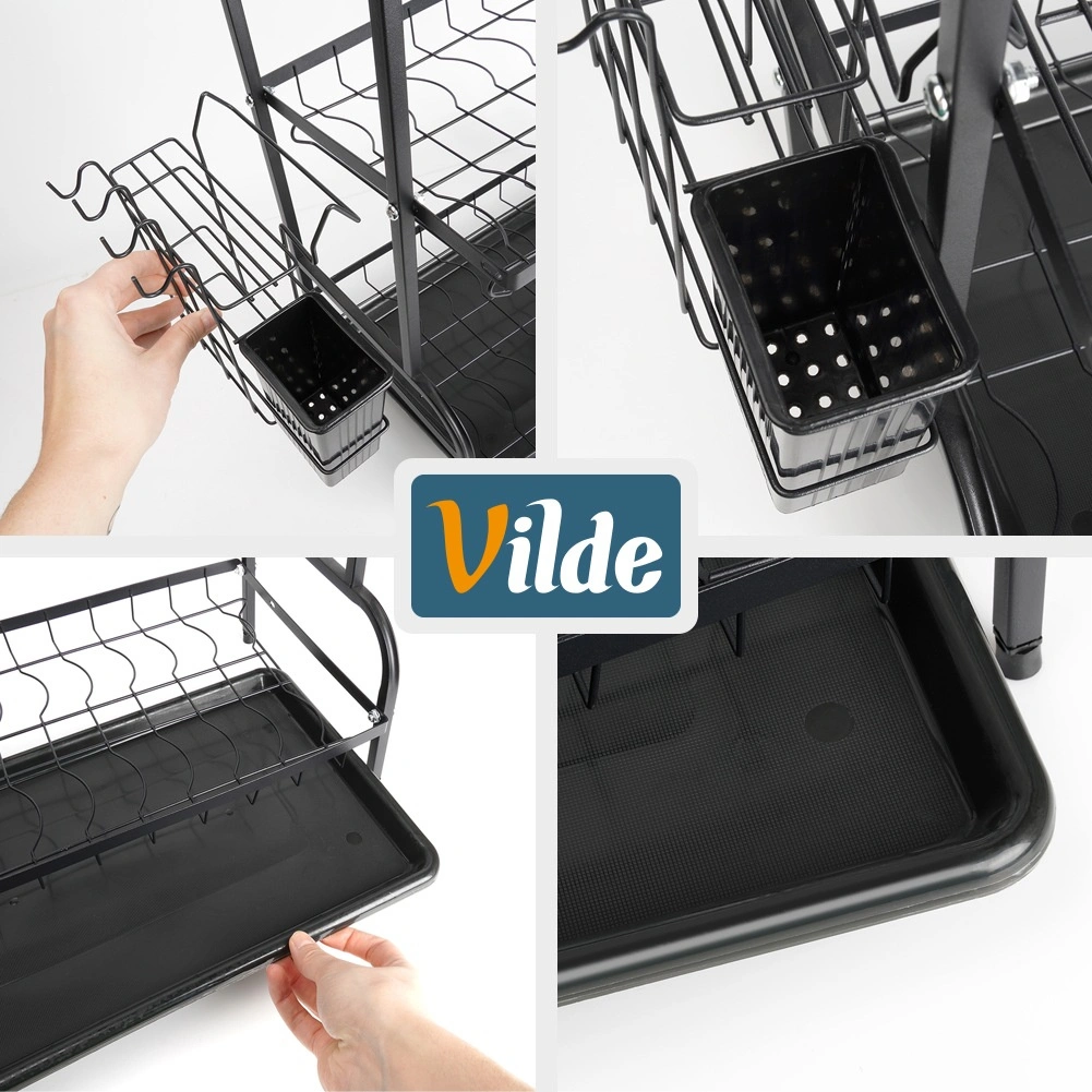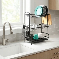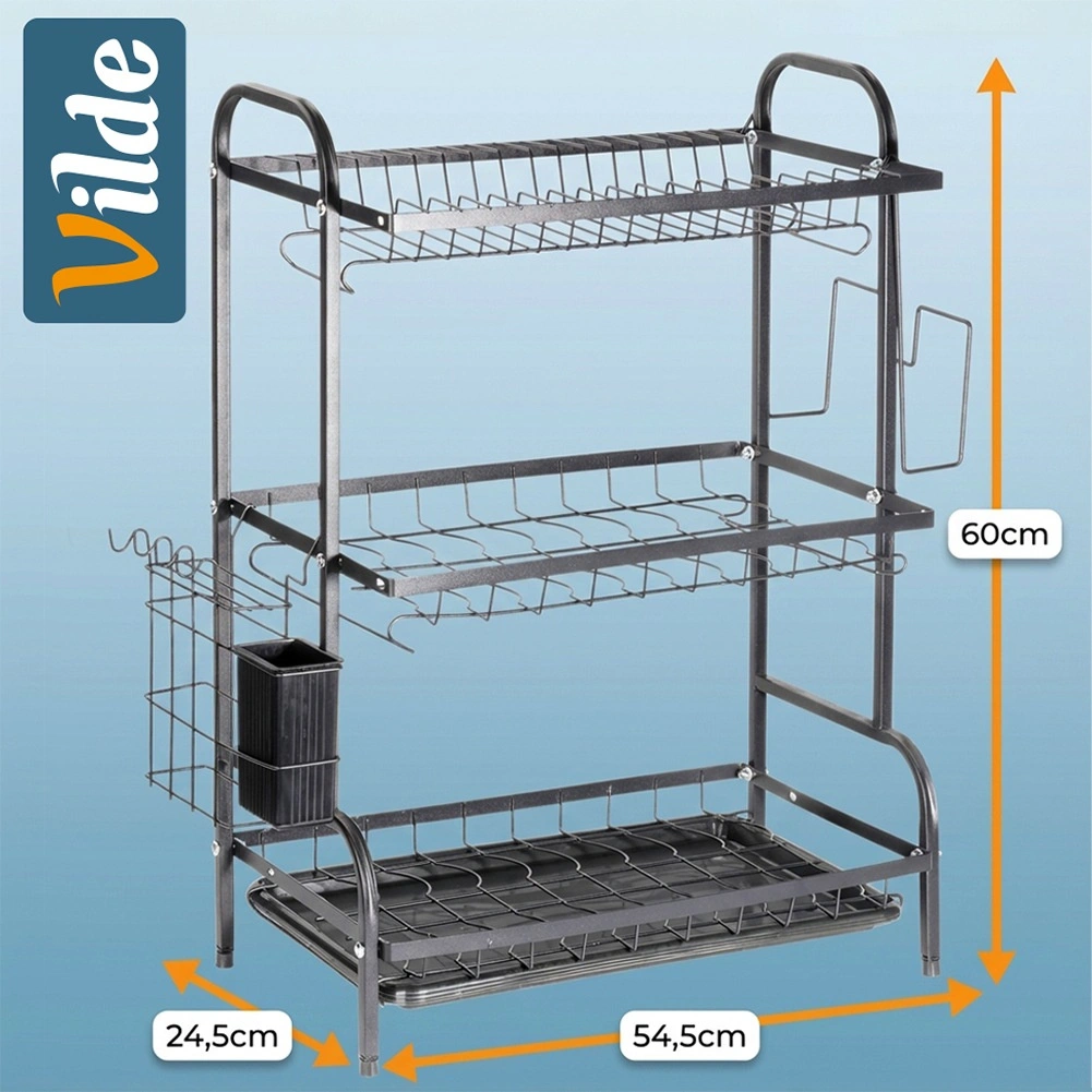 Maximalizujte prostor u dřezu s tříúrovňovým černým odkapávačem z odolného kovu. Horní patro pojme až 16 talířů, spodní úrovně jsou ideální pro misky, sklenice a hrnky. Odnímatelný košík na příbory a boční držák na prkénko rozšiřují sušící plochu, zatímco vyjímatelná odkapávací miska zachytí vodu a udrží desku suchou.