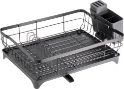 Praktický kovový odkapávač na nádobí s rozměry 48 × 32,5 × 18,5 cm nabídne velkou kapacitu, pevnou a odolnou konstrukci a odnímatelný tříkomorový košík na příbory. Integrovaná odkapávací miska s výlevkou odvádí vodu přímo do dřezu a udržuje suchou a čistou pracovní desku. Elegantní černé provedení v loft stylu skvěle zapadne do moderních i klasických kuchyní.