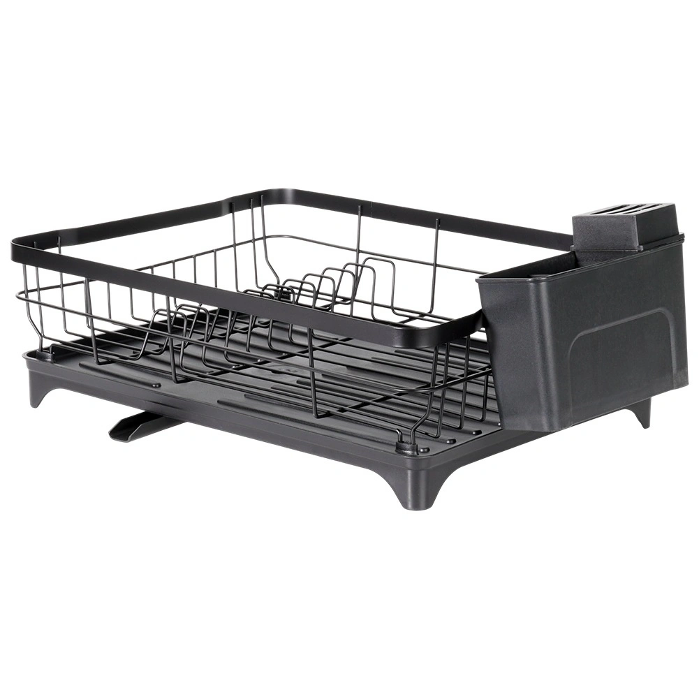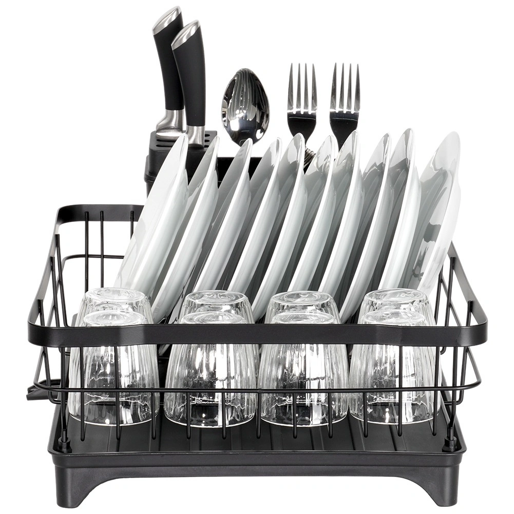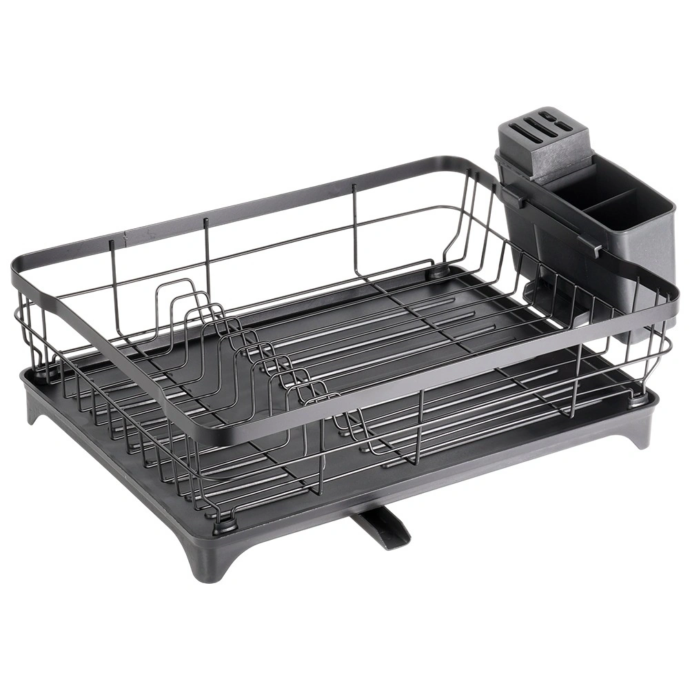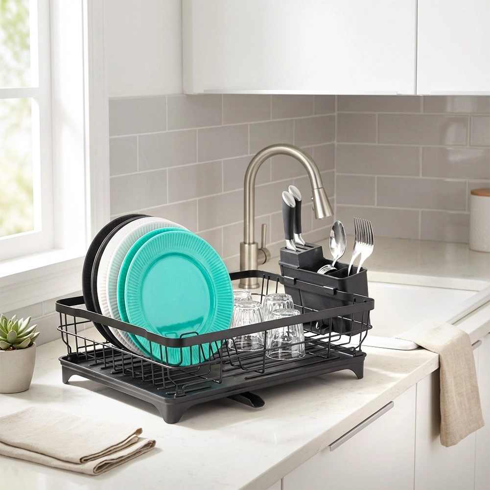 Odkapávač na nádobí kombinuje funkčnost a stylový design. Robustní drátěná konstrukce z nerezového kovu v černé barvě a kvalitní plastová odkapávací miska se snadno čistí a dlouho vydrží. Díky promyšlenému členění pojme talíře, sklenice i misky, zatímco tříkomorový košík udrží příbory přehledně oddělené.