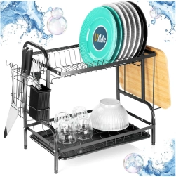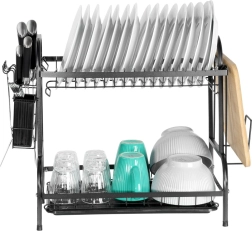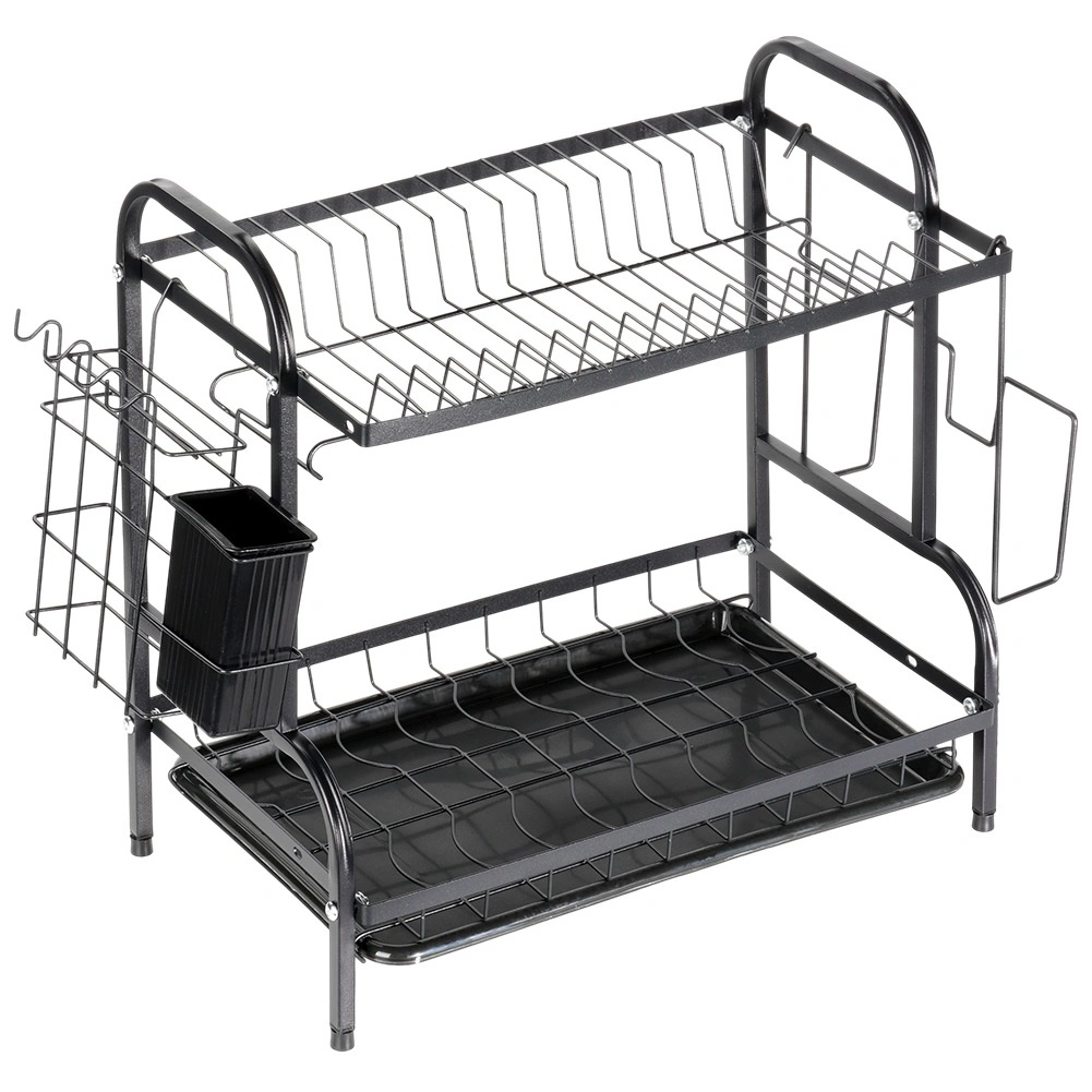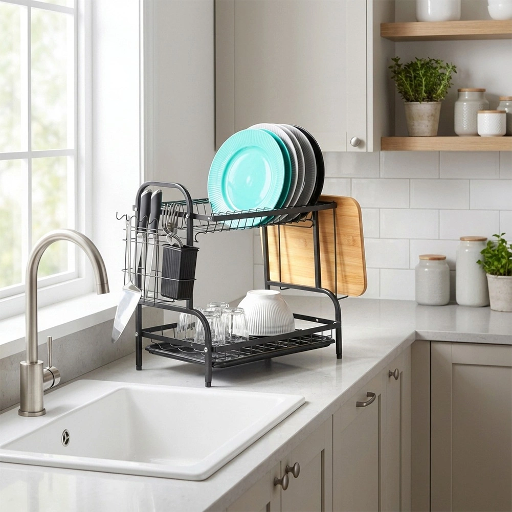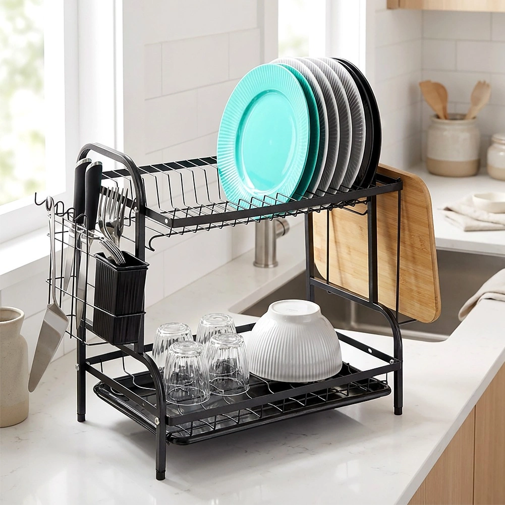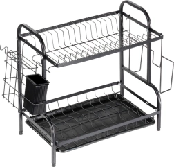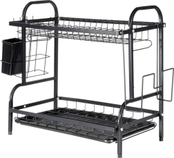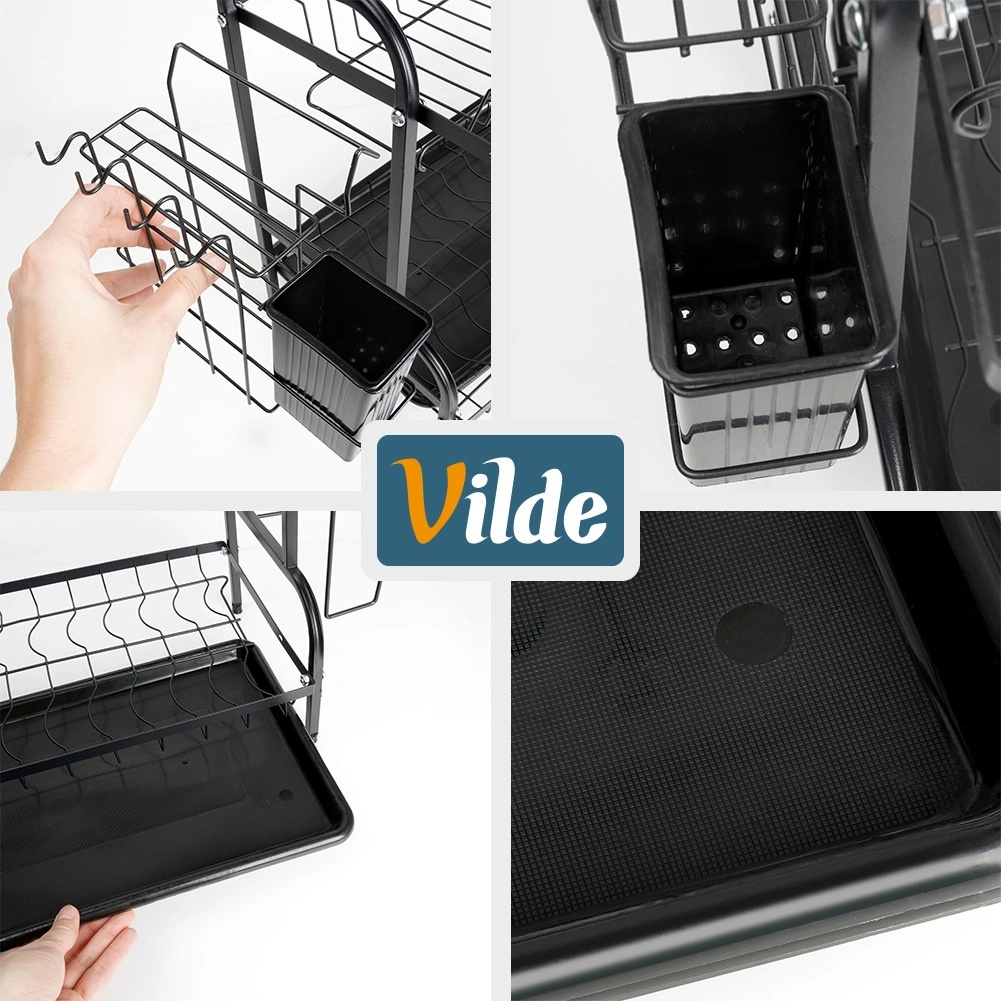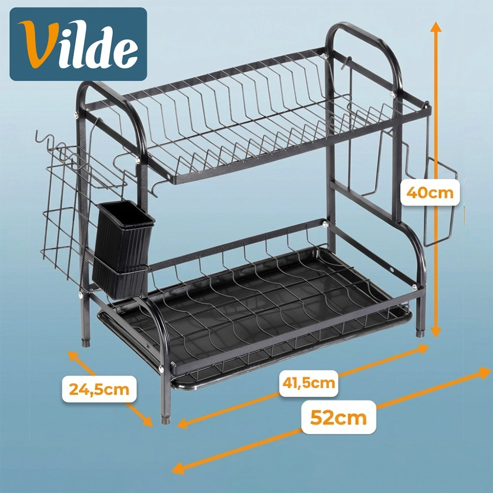 Robustní kovová konstrukce v matně černém provedení je odolná a nenáročná na údržbu. Spodní odkapávací tác z plastu zachytává vodu a chrání kuchyňskou linku před skvrnami. Celé řešení je ideální do menších kuchyní i domácností, které chtějí mít nádobí vždy přehledně uspořádané.