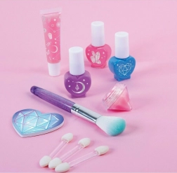 Stylové kosmetické studio v přenosném kufříku pro malé parádnice od 8 let. Součástí je zrcátko ve tvaru srdce s LED osvětlením, 12 očních stínů, tvářenky, lak na nehty, lesk a balzám na rty i štětečky. Ideální pro kreativní líčení doma i na cestách.