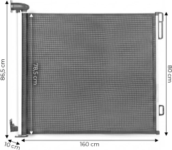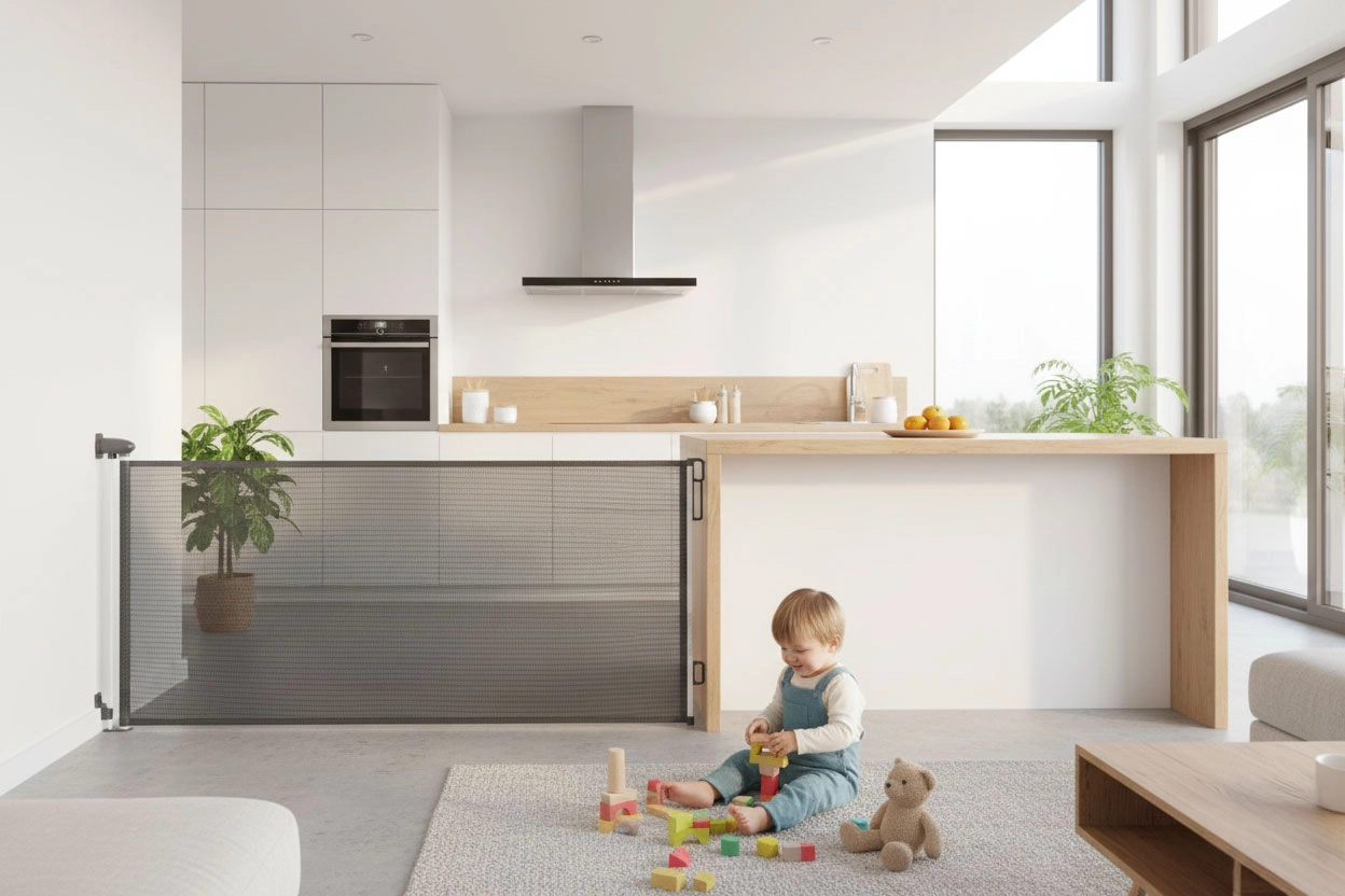 Výsuvná zábrana ECOTOYS je spolehlivé řešení pro zablokování přístupu ke schodišti, kuchyni či technickým místnostem. Hustě tkaná PVC síť zajišťuje dobrou viditelnost a proudění vzduchu, zároveň však vytváří pevnou fyzickou bariéru pro malé děti a domácí zvířata.