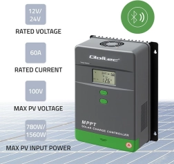 Výkonný solární regulátor s technologií MPPT pro maximální využití energie z panelů. Nabízí 60 A nabíjecí proud, podporu 12/24 V, přehledný LCD displej, Bluetooth a ovládání přes mobilní aplikaci. Je kompatibilní s akumulátory GEL a LiFePO4, disponuje teplotním čidlem a pokročilými ochranami proti přebití, přetížení a opačné polaritě.