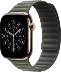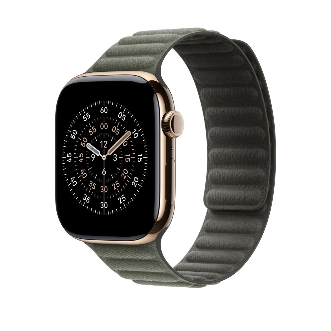 Karbonovaný, jemně žebrovaný design z materiálu FineWoven zajišťuje měkký dotyk a elegantní vzhled. Speciálně tvarované magnety automaticky přitahují a jemně napínají pásek při pohybu ruky, takže zůstává pevně a pohodlně na místě po celý den.
