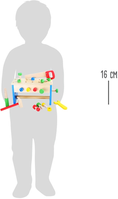 Součástí jsou šroubovák, klíč, kladivo, pila, šrouby a matice – vše uzpůsobeno malým dětským rukám pro bezpečnou hru.