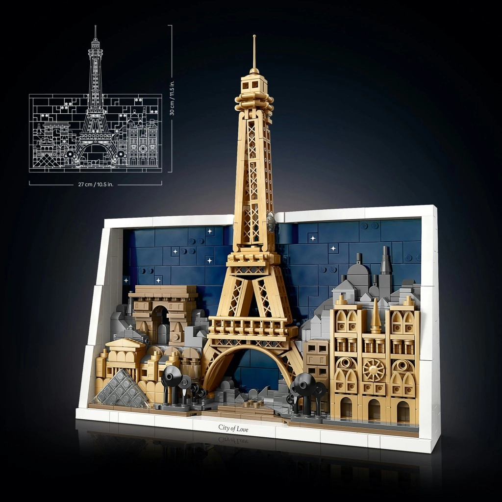 Tato designová stavebnice přenáší kouzlo francouzské metropole do vašeho interiéru. V kompaktním panoramatu najdete katedrálu Notre-Dame, Vítězný oblouk, skleněnou pyramidu Louvru a další pařížské ikony. Neutrální béžové, šedé a černé tóny podtrhují autenticitu a zaručují, že model skvěle zapadne do moderního i klasického interiéru.