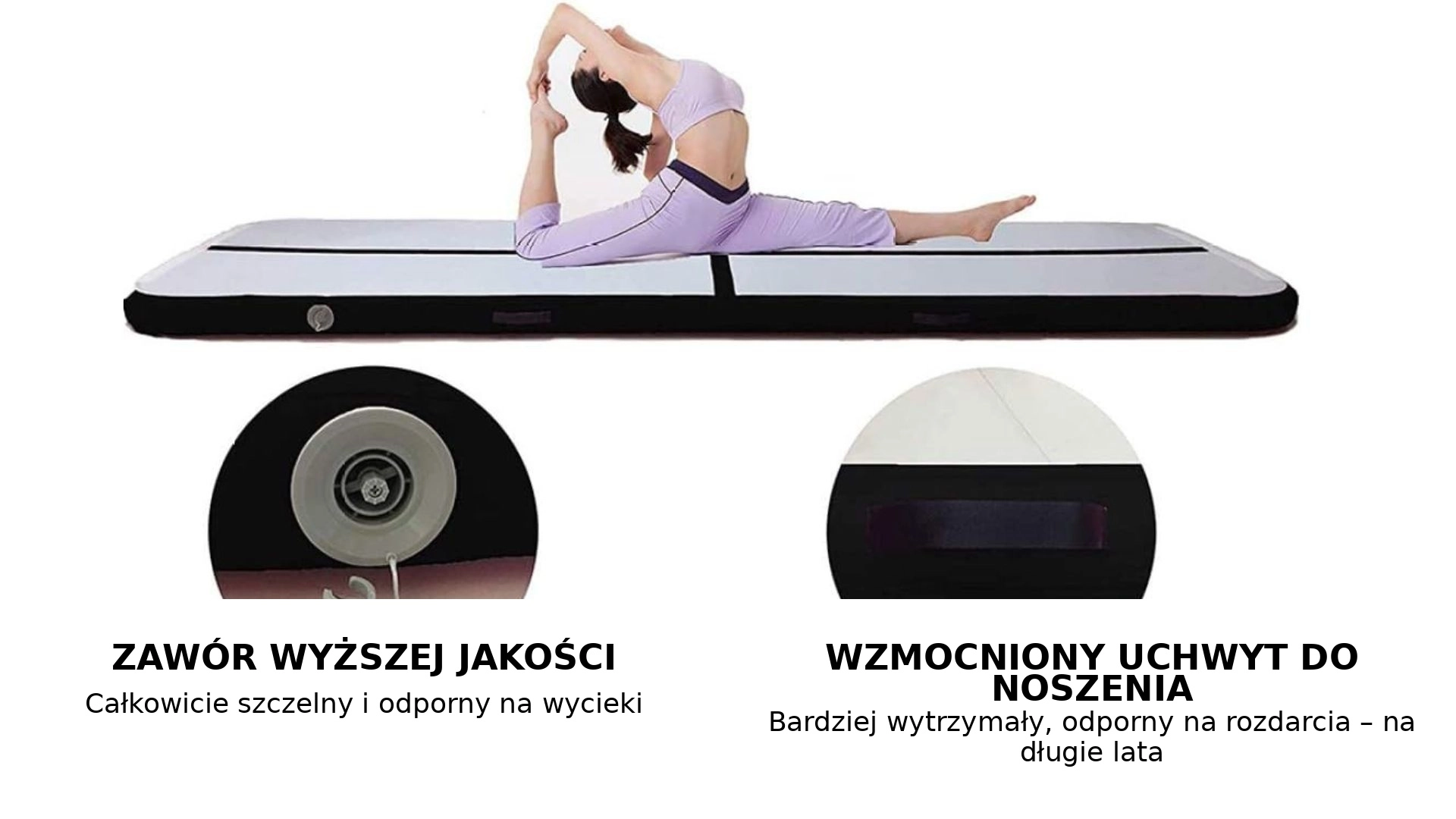 Kvalitní PVC s výztužemi, pevná madla a spolehlivý ventil zaručují dlouhou životnost, snadné přenášení a udržení tlaku během cvičení.