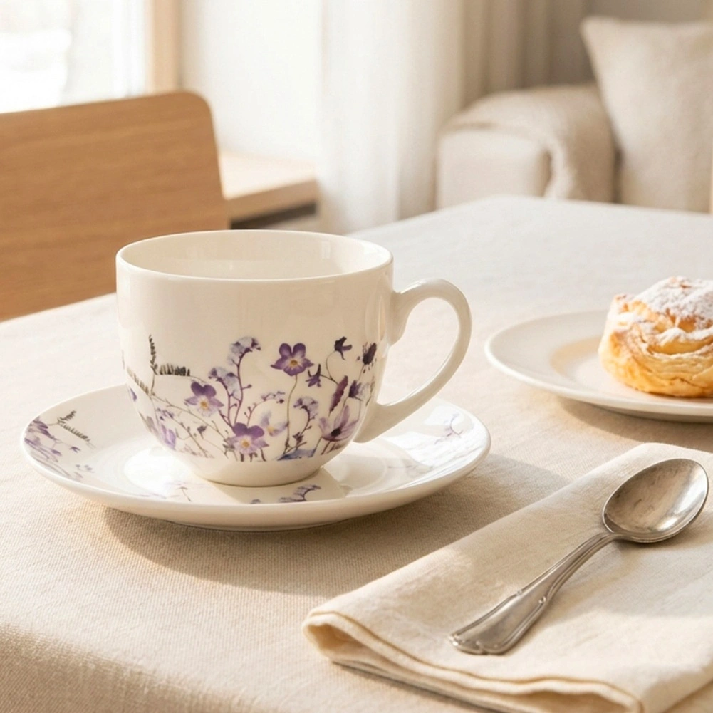 Praktický tvar s ergonomickým uchem zajišťuje pohodlné pití, zatímco podšálek tvoří stabilní a elegantní základnu. Kvalitní porcelán je odolný při každodenním používání a umožňuje snadnou údržbu v myčce i rychlé ohřátí v mikrovlnce.
