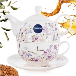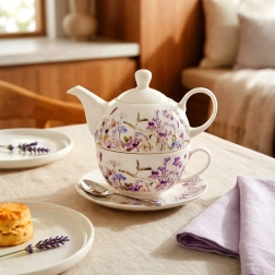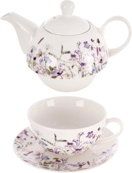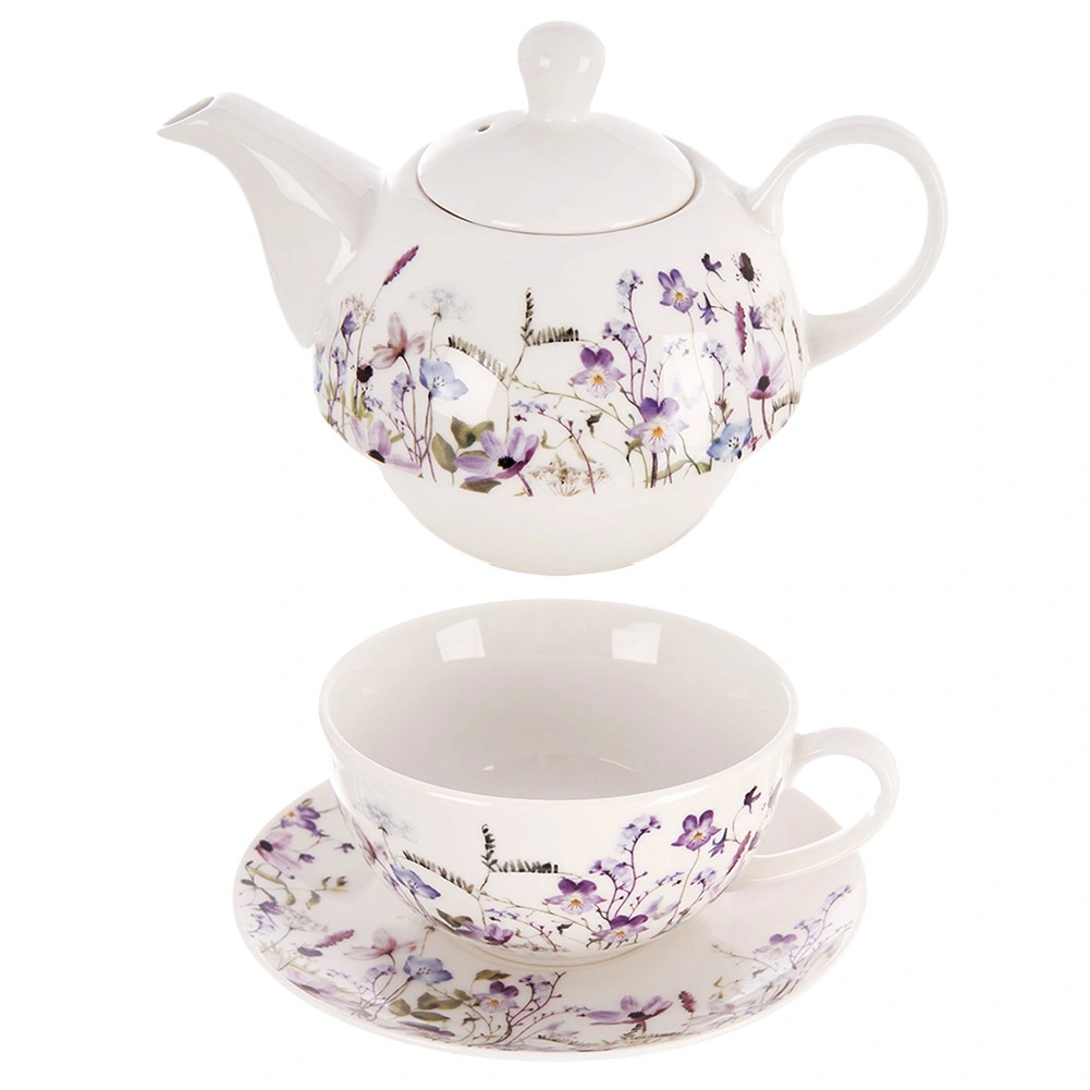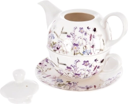 Tato porcelánová sada na čaj pro jednoho je navržena pro maximální pohodlí a styl. Konvičku lze uložit přímo na šálek, což šetří místo a vytváří harmonický celek. Jemná dekorace loučních květů v odstínech fialové a růžové dodá stolování romantický nádech a snadno se sladí s ostatním nádobím.