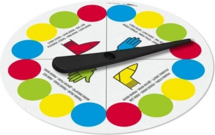 Spinner se čtyřmi barvami a instrukcemi určuje, kam položit ruku nebo nohu. Každé roztočení přináší nový úkol a více smíchu.