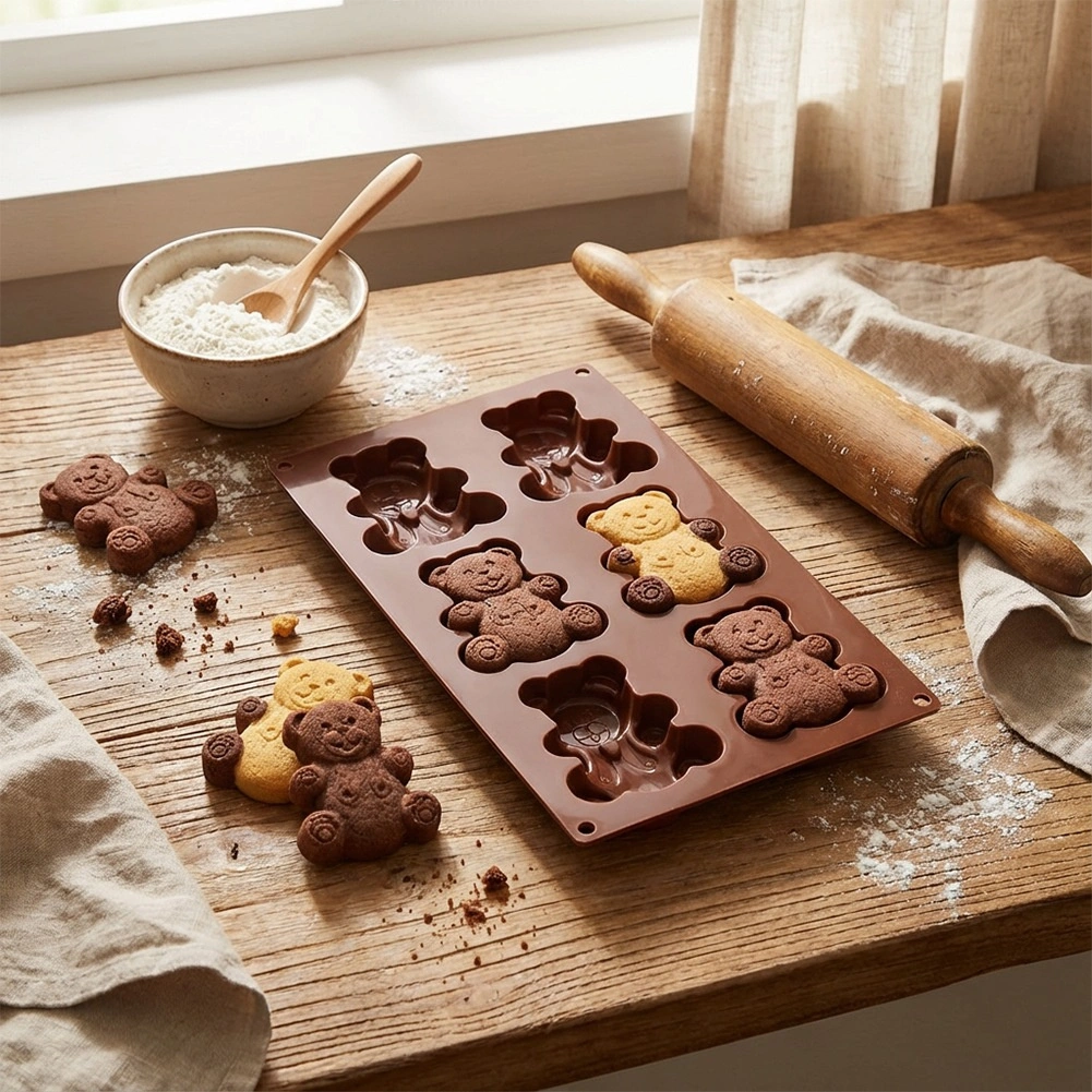 Tato obdélníková silikonová forma umožní pohodlně připravit efektní sladkosti ve tvaru roztomilých medvídků – od sušenek a muffinek po piškoty, perníčky, pralinky či nepečené dezerty. Díky pružnému a nepřilnavému silikonu se těsto nepřichytává a hotové tvary snadno vyjmete bez nutnosti vymazávání.
