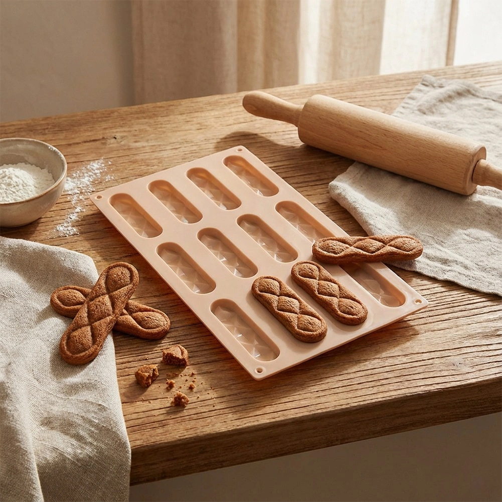 Forma obsahuje dvanáct podélných dutin, které pomohou připravit stejnoměrné sušenky nebo tyčinky s jednotnou velikostí.
