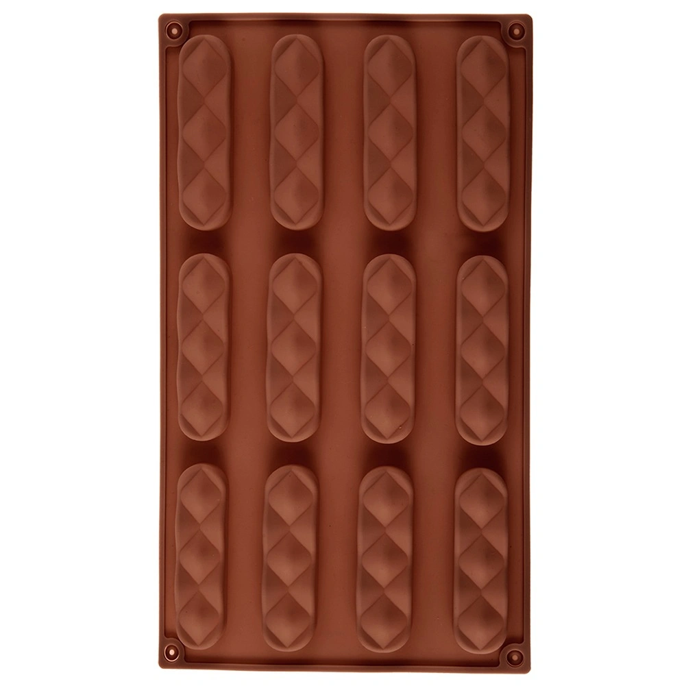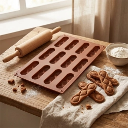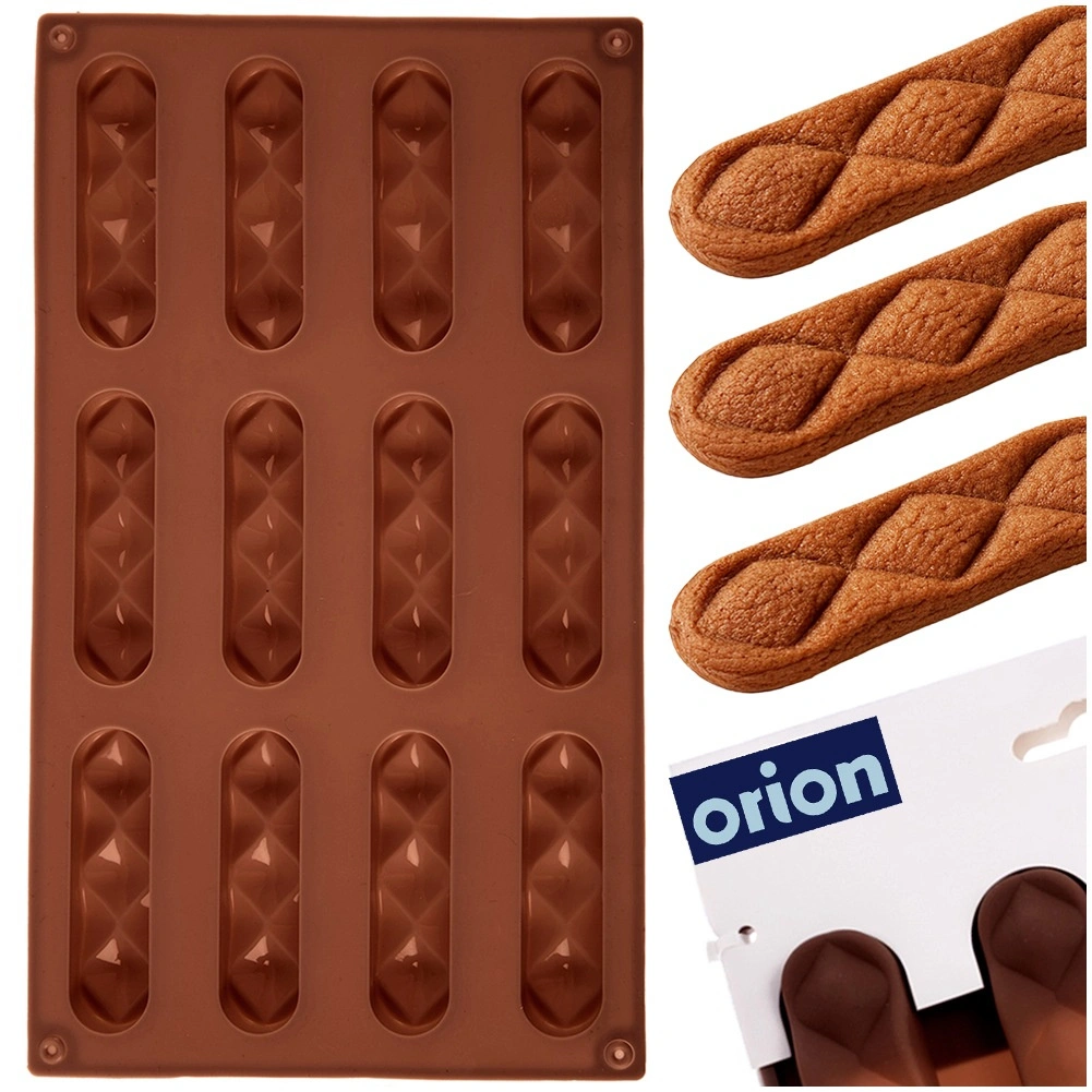 S touto kvalitní silikonovou formou připravíte křehké sušenky i domácí pralinky v elegantním podlouhlém tvaru. Jedna dávka pojme 12 kusů o velikosti přibližně 8 × 2 × 1 cm, které se díky nepřilnavému povrchu snadno vyjmou bez lámání. Forma zajistí rovnoměrné propečení a krásný dekor s diamantovým vzorem.