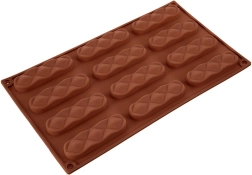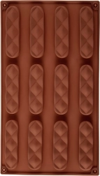 Forma má dvanáct protáhlých dutin s dekorativním vzorem, díky nimž vytvoříte jednotné a estetické sušenky či pralinky během jedné várky.