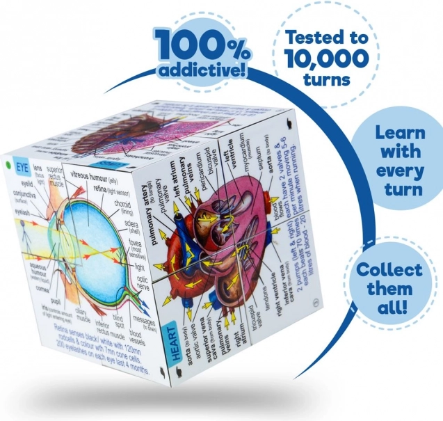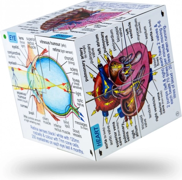 Kostka se skládá ve všech směrech a nabízí mnoho kombinací, v nichž se zobrazují orgány a tělesné soustavy s přehlednými popisky v angličtině. Je vyrobena z odolného PVC, splňuje aktuální evropské bezpečnostní normy a je vhodná pro děti od 7 let.