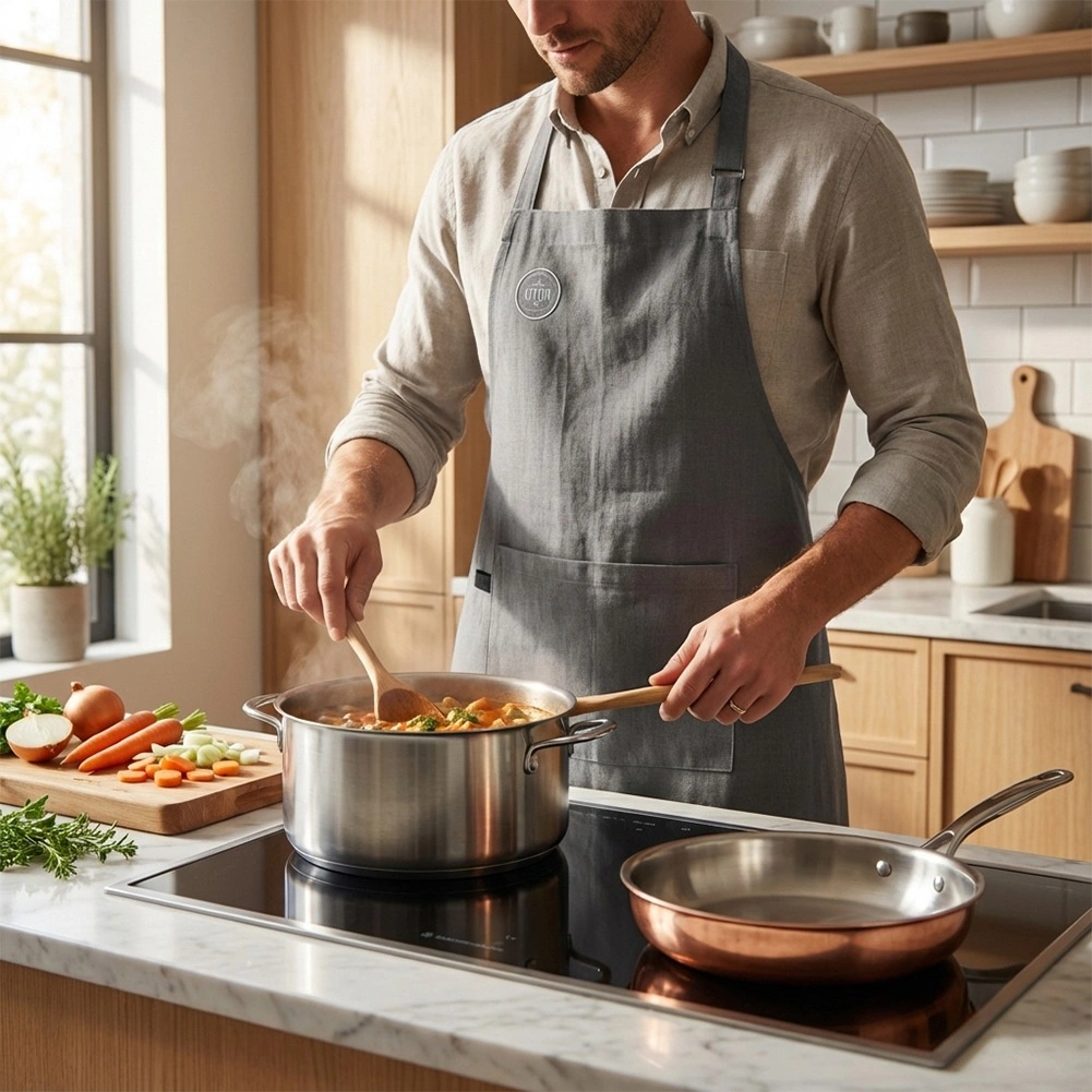 Praktická přední kapsa pojme recept, utěrku nebo drobné kuchyňské náčiní, které chcete mít stále po ruce. Zástěra poskytuje spolehlivou ochranu proti stříkancům a nečistotám při vaření, pečení, grilování i při tvoření a dílenských pracích.