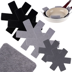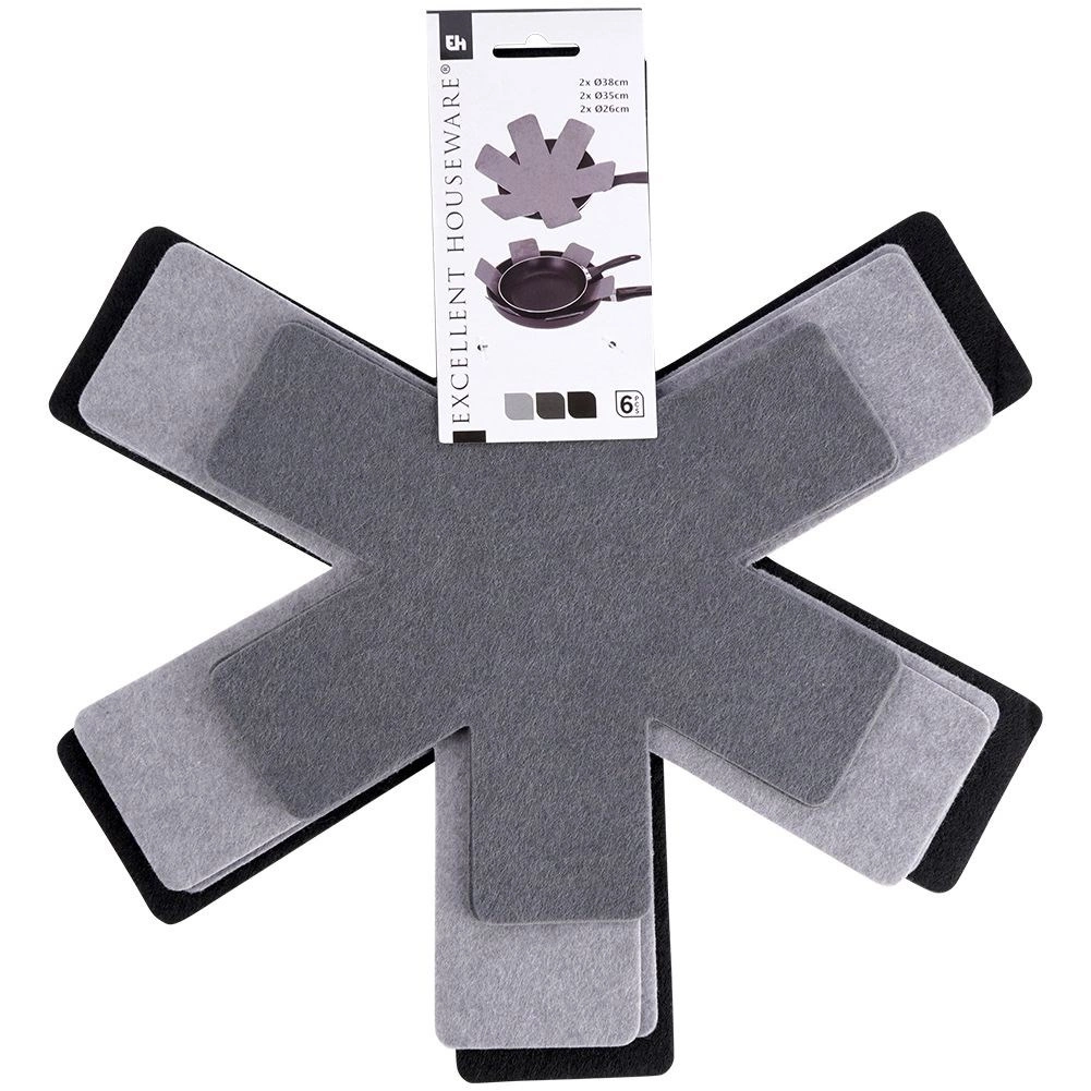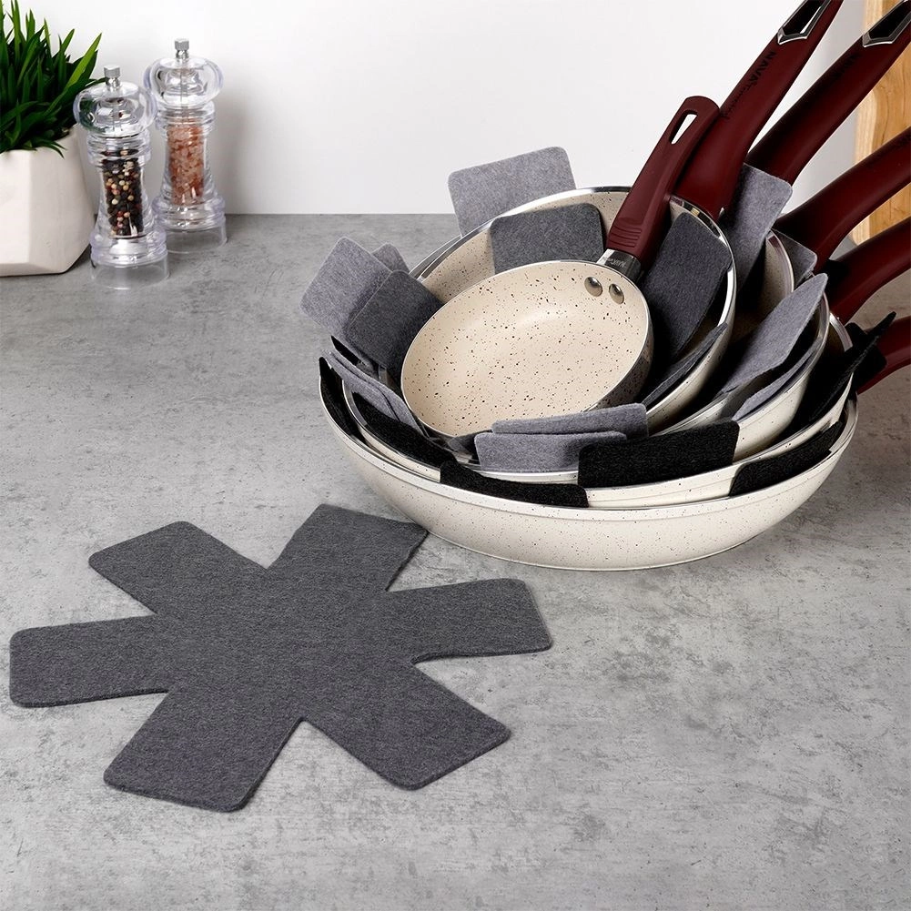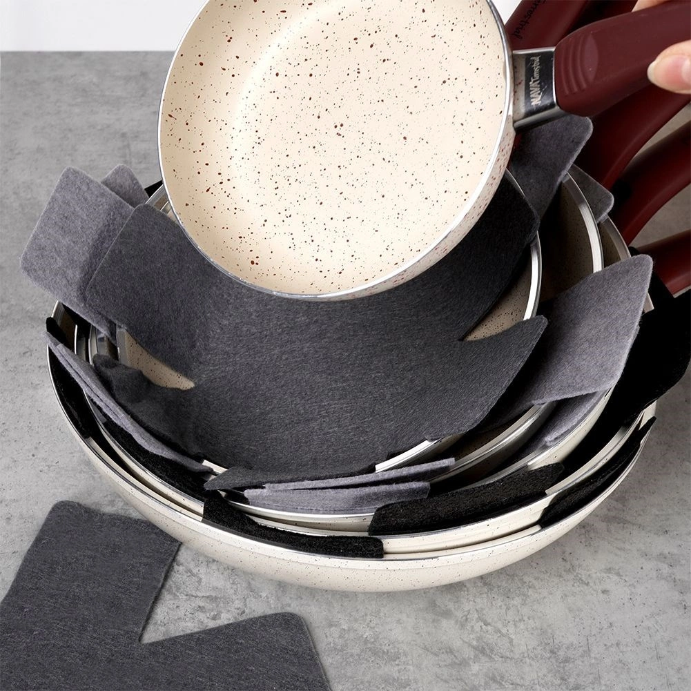 Praktická sada filcových vložek pro bezpečné stohování pánví, hrnců a mís. V balení je 6 kusů ve třech velikostech, které spolehlivě zabrání poškrábání nepřilnavých povrchů a šetří místo ve skříňkách. Chrání nádobí, zabraňují oděrkám a umožňují bezstarostné ukládání na sebe.