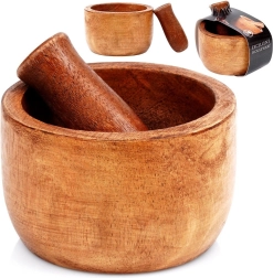 Praktický dřevěný hmoždíř z mangového dřeva s ergonomickým tloučkem pro snadné drcení koření, bylinek a semínek. Nabízí pevnou konstrukci, odolnost vůči vlhkosti a deformacím a přirozený vzhled, díky kterému je skvělým pomocníkem i stylovým doplňkem každé kuchyně.