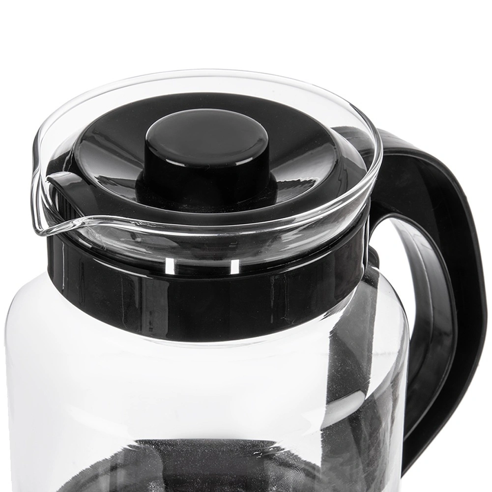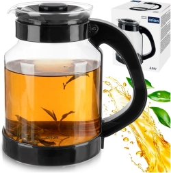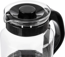 Univerzální skleněný džbán o objemu 2,25 l pro pohodlné přípravu a servírování čaje, kávy i studených nápojů. Vyroben z odolného borosilikátového skla s černým víčkem a ergonomickým uchem pro bezpečné nalévání. Vysoká odolnost vůči teplotám, praktická výlevka a víčko pro udržení čerstvosti dělají z tohoto džbánu skvělou volbu pro každodenní použití doma i v kanceláři.