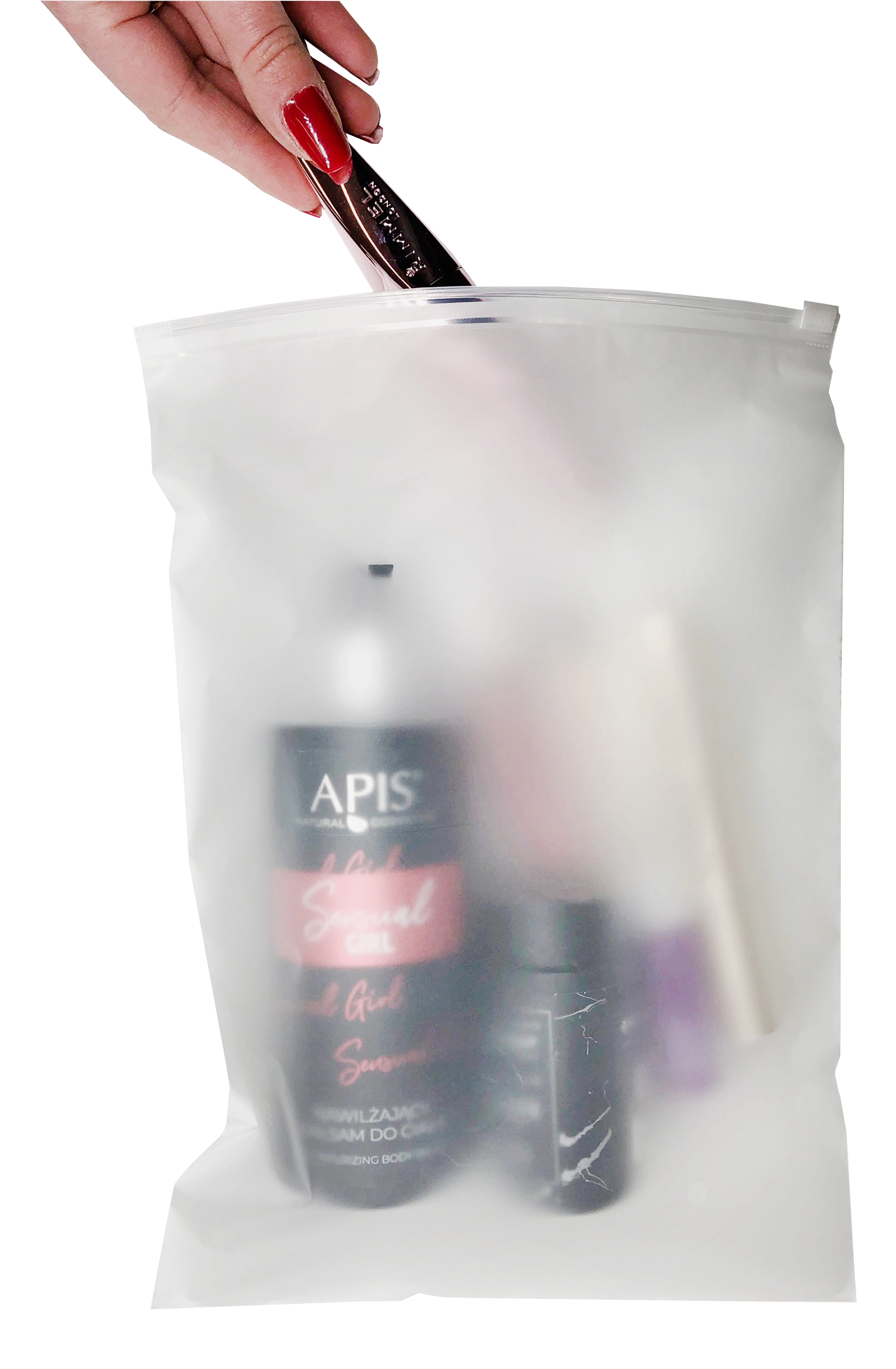 Polomatné sáčky udrží lahvičky, tuby a štětce pohromadě, ochrání je před únikem vlhkosti a nečistotami a usnadní balení na cesty.