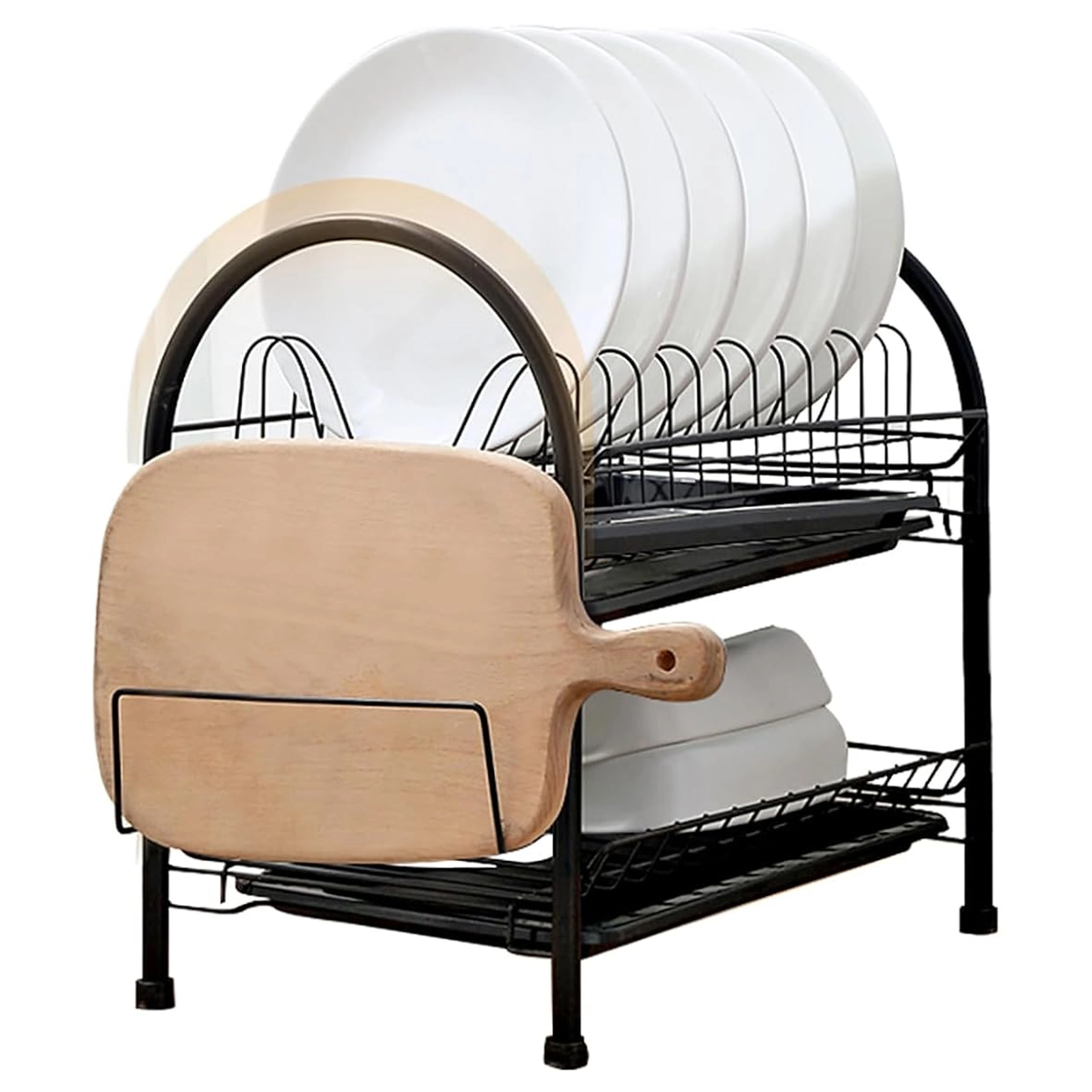 Tento prostorný dvoupatrový odkapávač kombinuje pevnou kovovou konstrukci s moderním designem, který se hodí do každé kuchyně. Horní patro je ideální pro talíře, spodní pro misky či sklenice a boční držáky pojmou příbory a prkénko. Odnímatelné tácy zachytí vodu a udrží linku bez kapek.