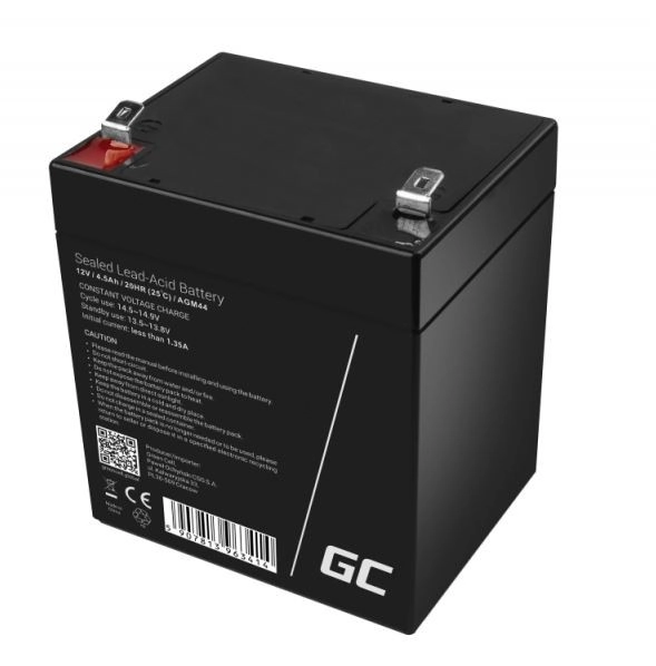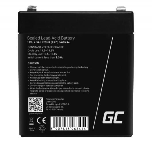 Spolehlivý bezúdržbový AGM VRLA akumulátor 12V 4.5Ah od Green Cell pro stabilní napájení zařízení jako alarmy, pokladny, UPS či hračky. Nabízí dlouhou životnost, bezpečný provoz a kompaktní rozměry pro snadnou instalaci.