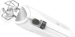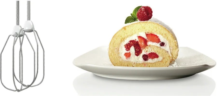 Součástí balení jsou nerezové šlehací metly pro perfektní aeraci krémů a bílků a odolné hnětací háky pro rovnoměrné zpracování těsta. Praktické tlačítko pro uvolnění nástavců zajišťuje snadnou výměnu a čištění. Lehká konstrukce a pohodlné držení zaručují komfortní použití i při delším šlehání.