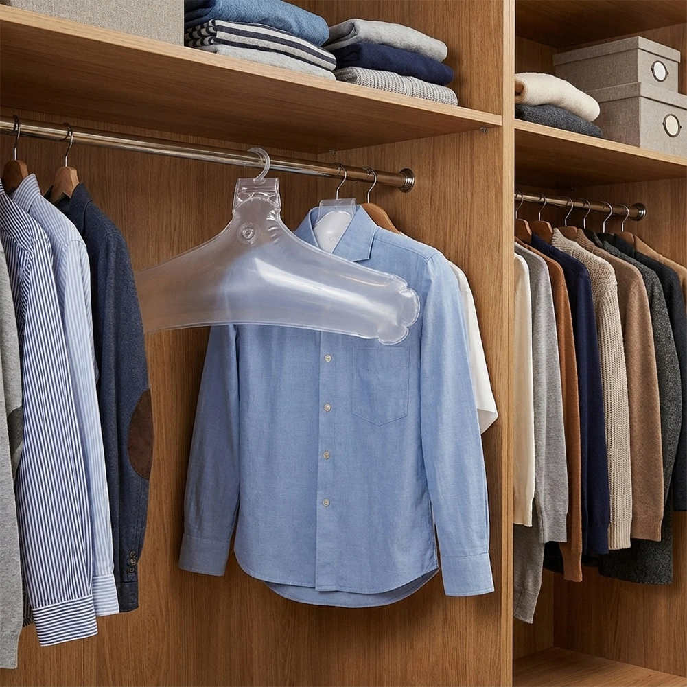Tyto průhledné nafukovací ramínka s háčkem jsou navrženy pro šetrné sušení a skladování oděvů. Po nafouknutí vytvářejí rozšířenou oporu ramen, která minimalizuje mačkání a deformaci citlivých tkanin. Skvěle se hodí do hotelových podmínek i pro každodenní organizaci šatníku.