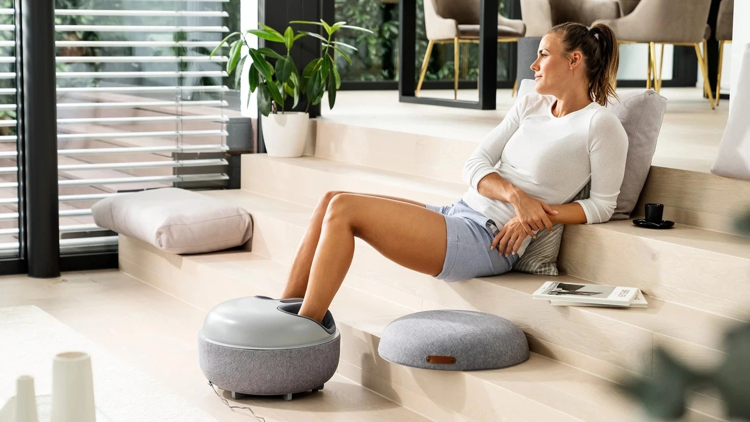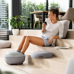 Pro ještě hlubší uvolnění je k dispozici volitelná funkce ohřevu, která pomáhá zklidnit svalové napětí a ztuhlé klouby. Přístroj nabízí 3 úrovně intenzity a 3 přednastavené programy, takže si masáž snadno přizpůsobíte svým potřebám. Po použití stačí nasadit víko a z přístroje se rázem stane stylový podnožník, který skvěle zapadne do interiéru.
