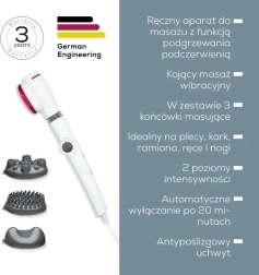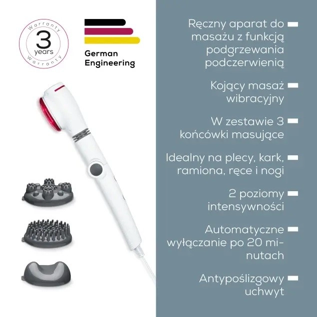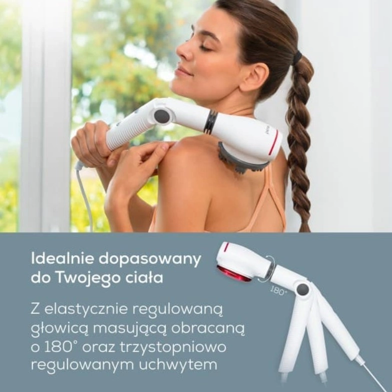 Díky velké masážní a hřejivé ploše a otočné hlavici v rozsahu 180° se snadno dostanete i na hůře dostupná místa. Tři kvalitní masážní nástavce umožňují přizpůsobit masáž vašim potřebám – od plošné po bodovou.