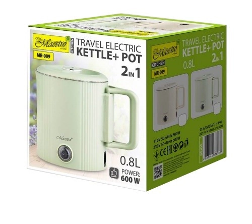 Kompaktní cestovní konvice a hrnec 2v1 MAESTRO MR-009 nabízí 0,8 l objem, výkon 600 W a skládací rukojeť pro snadné přenášení. Díky dvoustěnné konstrukci a vnitřnímu povrchu z nerezové oceli 304 rychle ohřeje vodu i jídlo. Duální napětí 110/230 V z něj dělá ideální volbu na cesty, kempování i do kanceláře.