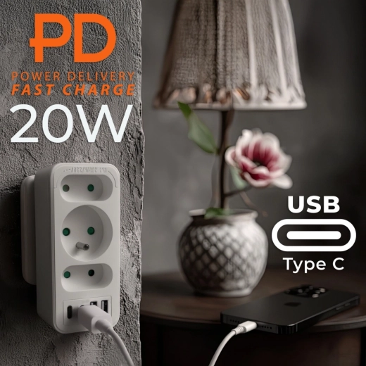 Praktický rozbočovač do zásuvky od značky MACLEAN rozšíří jednu zásuvku na více výstupů a zároveň nabídne rychlé nabíjení přes USB. Kombinuje 1 zásuvku Schuko pro spotřebiče s vyšším příkonem, 2 ploché Euro zásuvky pro drobnou elektroniku a 2× USB‑A (až 18 W) + 2× USB‑C s Power Delivery (až 20 W) pro rychlé nabíjení telefonu, tabletu či příslušenství – pohodlně a bezpečně na jednom místě.