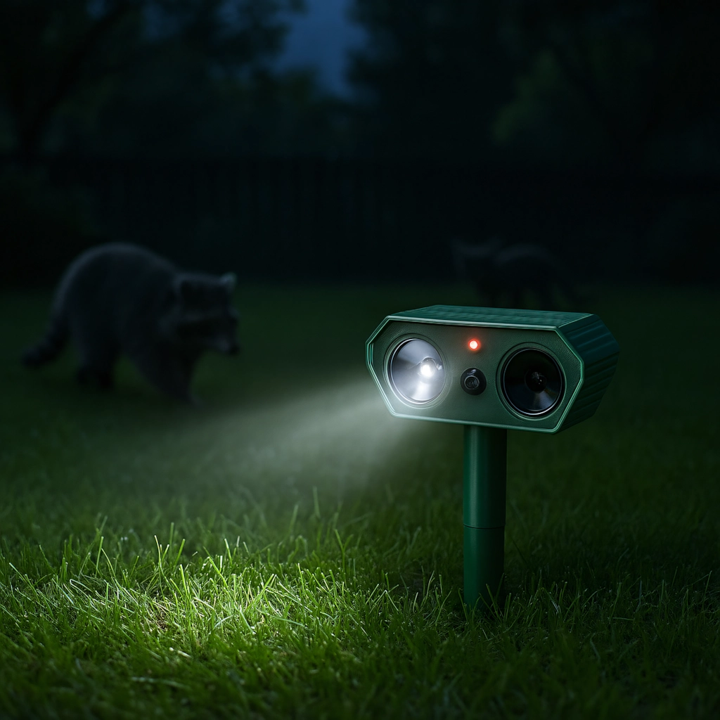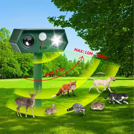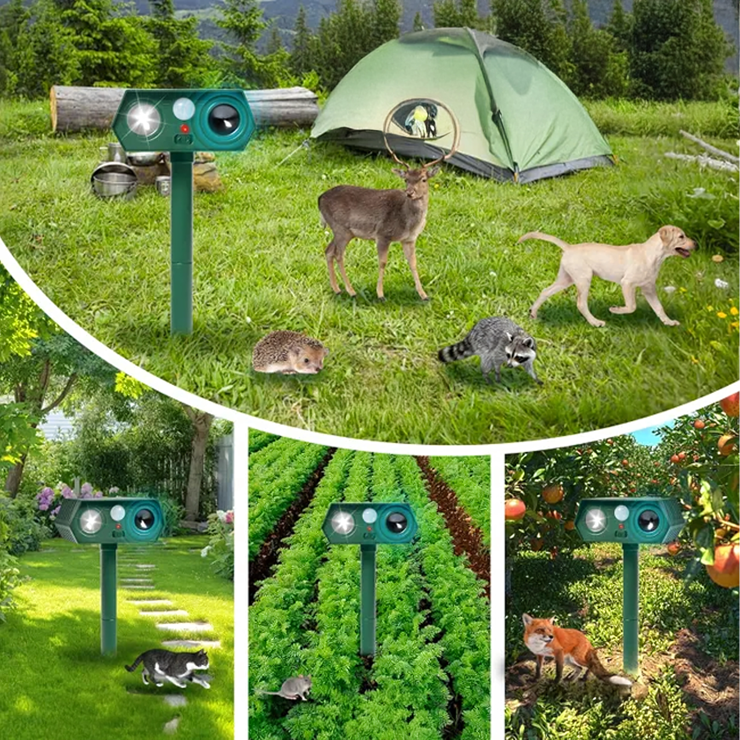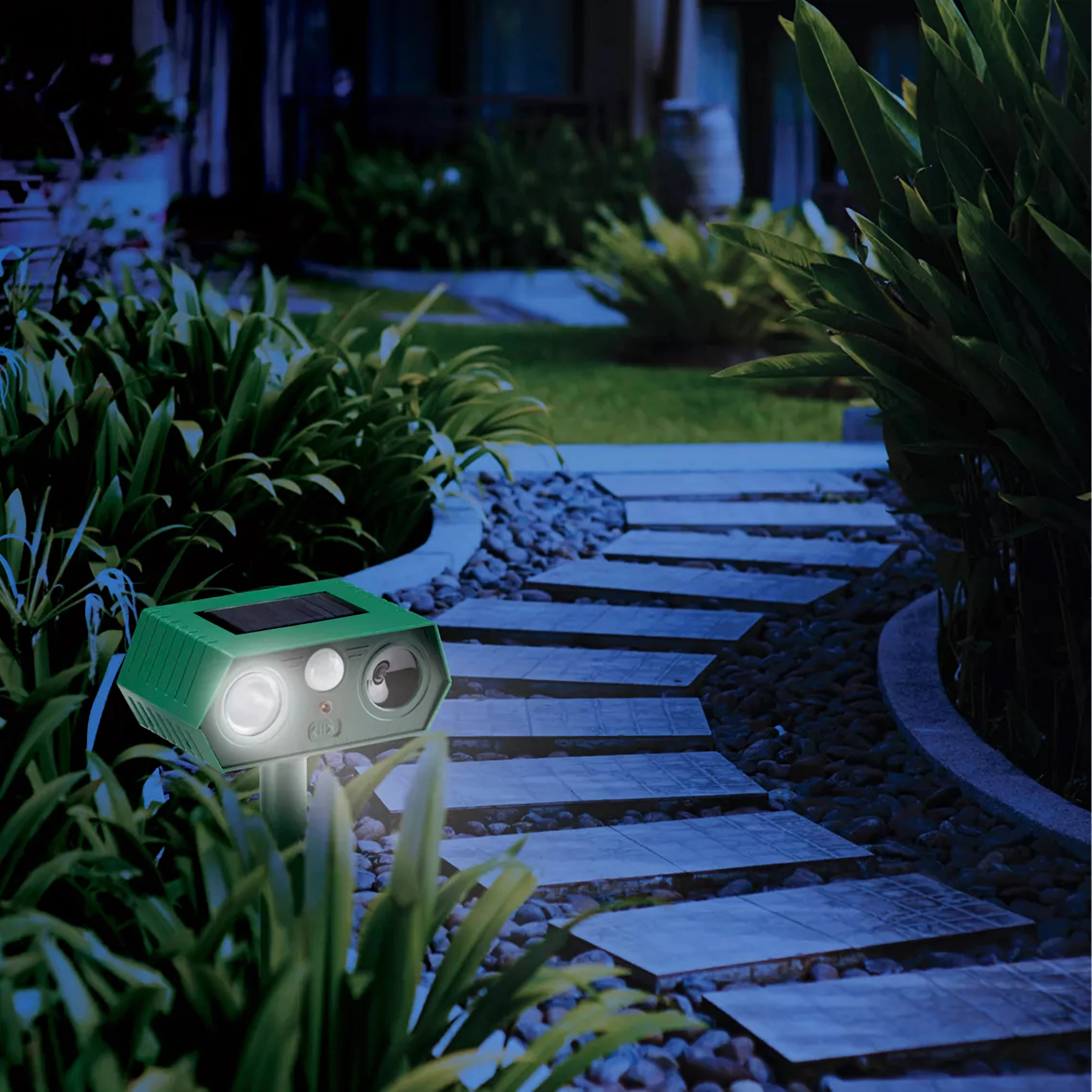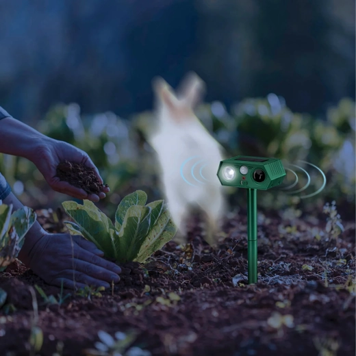 Ultrazvukový reproduktor a jasné LED světlo pomáhají odradit kočky, psy, lišky, kuny, zajíce, veverky, ptáky i drobné hlodavce.