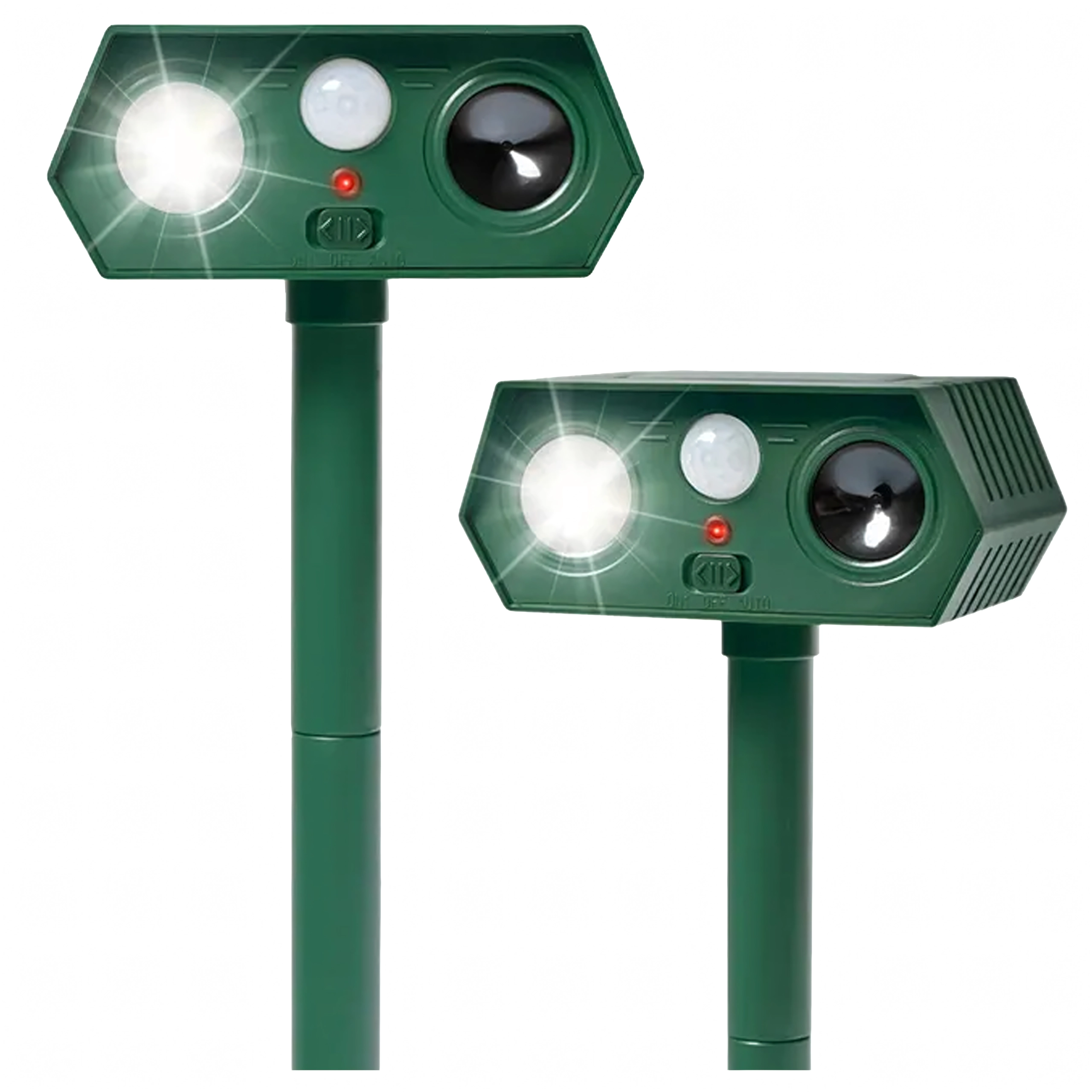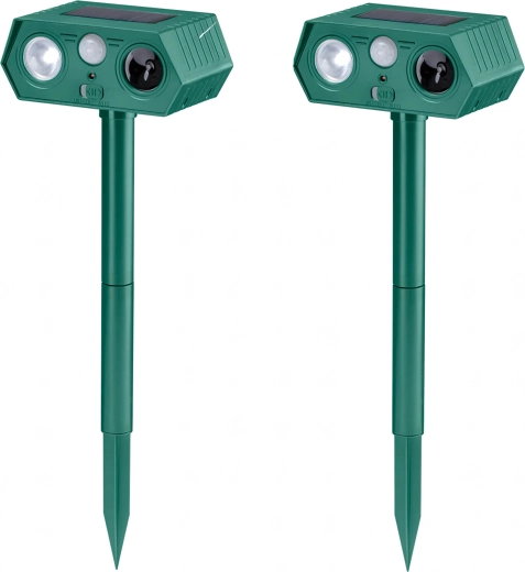 Udržte záhony, trávník i sady v bezpečí. Dvojice venkovních odpuzovačů kombinuje PIR detekci pohybu s ultrazvukovými vlnami a blikajícím LED světlem, které narušuje komfort zvířat a nutí je prostor opustit. Díky solárnímu napájení a odolnému plastu jsou vhodné pro celoroční použití bez složité údržby.