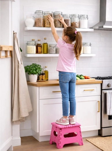 Ideální pro děti u umyvadla, pro snadné dosažení na vyšší police v kuchyni či šatně, jako pomocný sedák nebo praktický doplněk na kempování a cestování. Minimalistický design a kompaktní rozměry se hodí do každého interiéru.