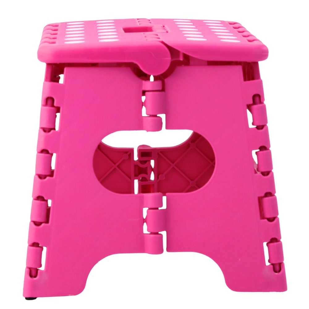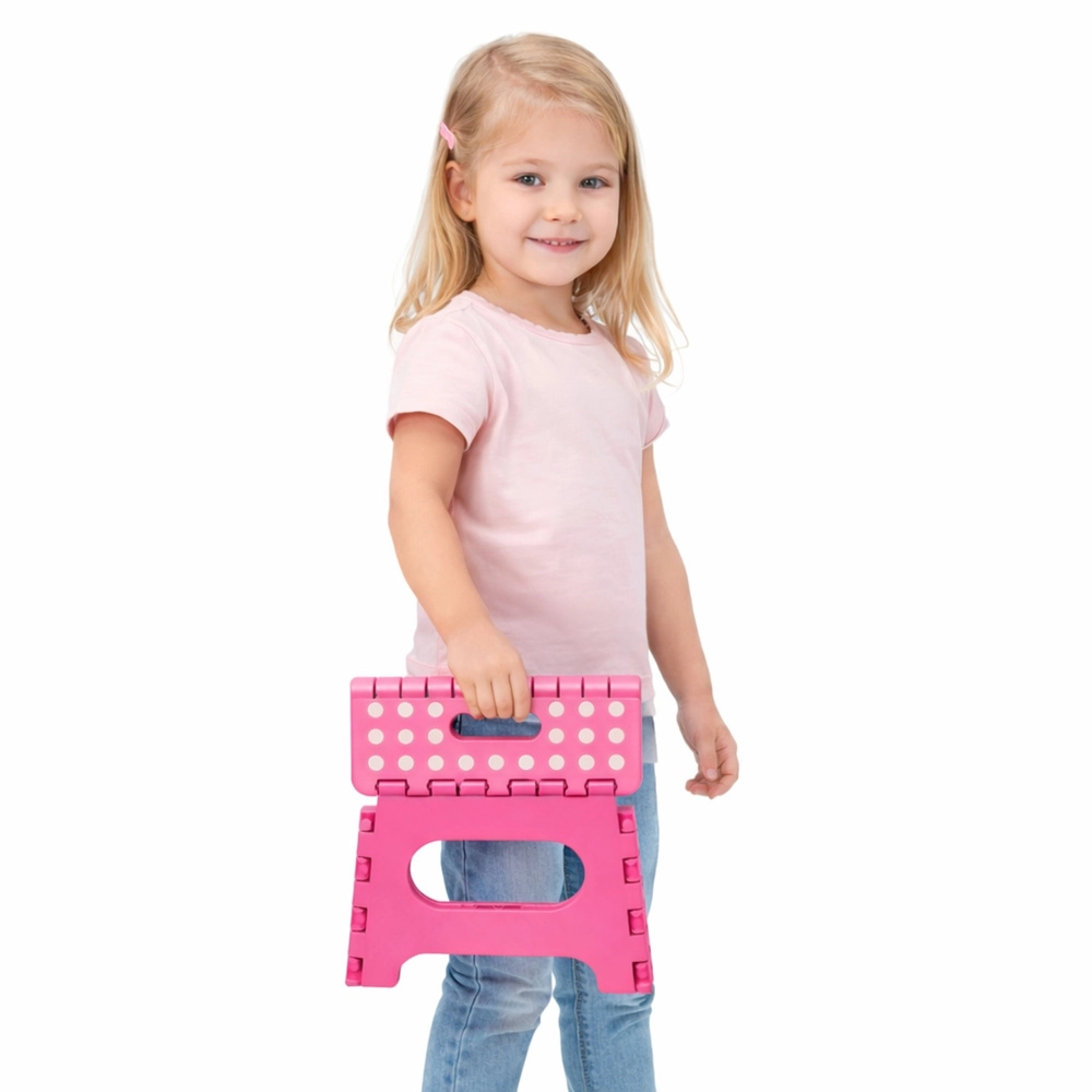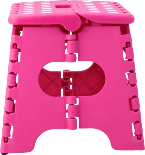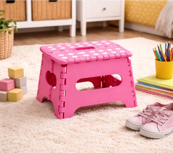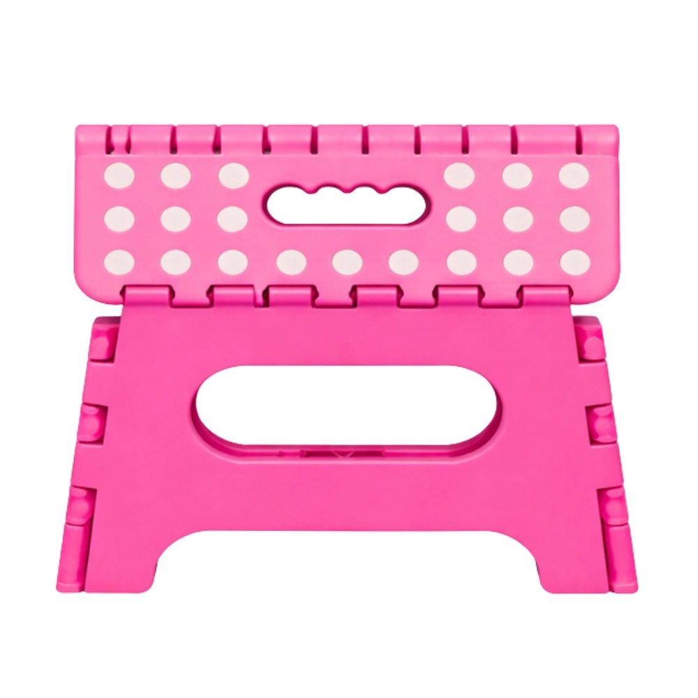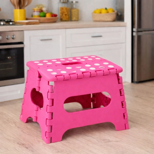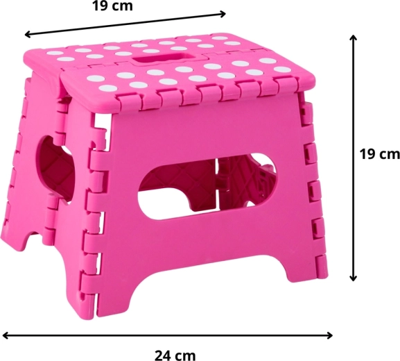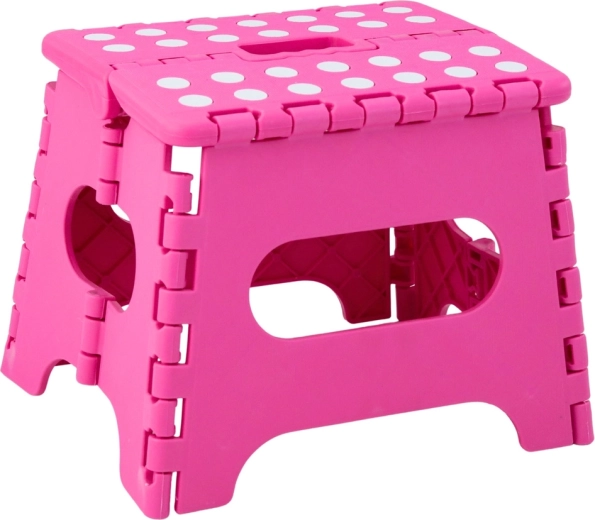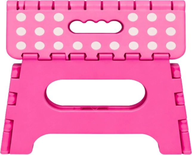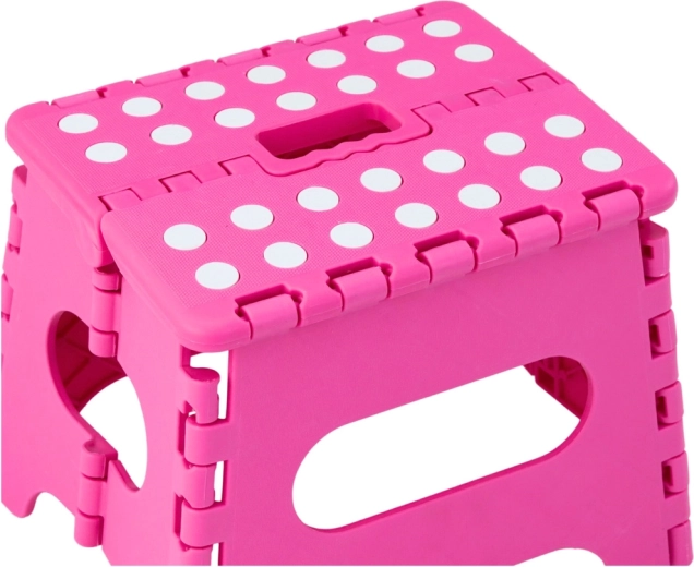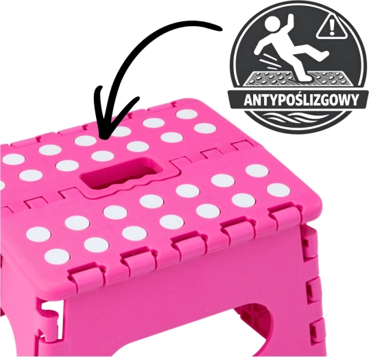 Růžový skládací schůdek je vyroben z odolného plastu, který zajišťuje pevnost a dlouhou životnost. Protiskluzová vrchní plocha s puntíky zvyšuje bezpečnost při používání, a to i ve vlhkém prostředí. Integrované madlo umožňuje rychlé přenášení i snadné složení na plochý tvar pro úsporné skladování.