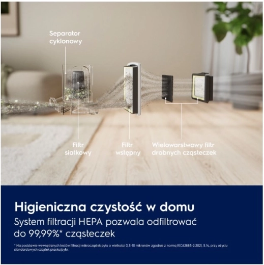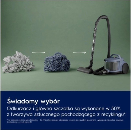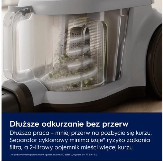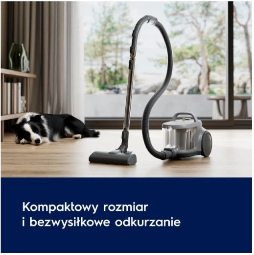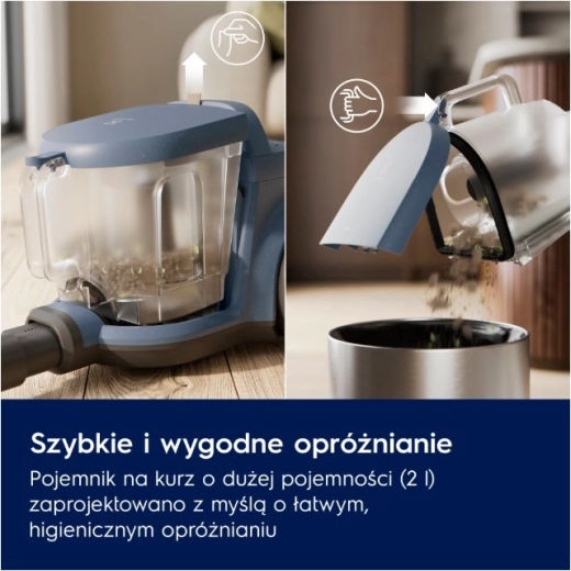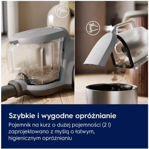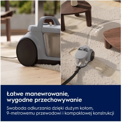 Technologie cyklónového separátoru omezuje ucpávání a udržuje stabilní výkon. Nádoba na prach o objemu 2 l se snadno vyjímá a jednou rukou hygienicky vysype bez zbytečného nepořádku. Ergonomická, kompaktní konstrukce, velká kola a dosah 9 m usnadňují manipulaci i skladování.