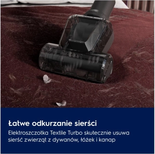 Pro domácnosti se zvířaty je k dispozici Turbo Textile hubice, která účinně sbírá zvířecí chlupy z koberců, lůžkovin a textilií. Dvojitý váleček zachytí i hluboko usazené vlasy a zanechá povrchy dokonale čisté.