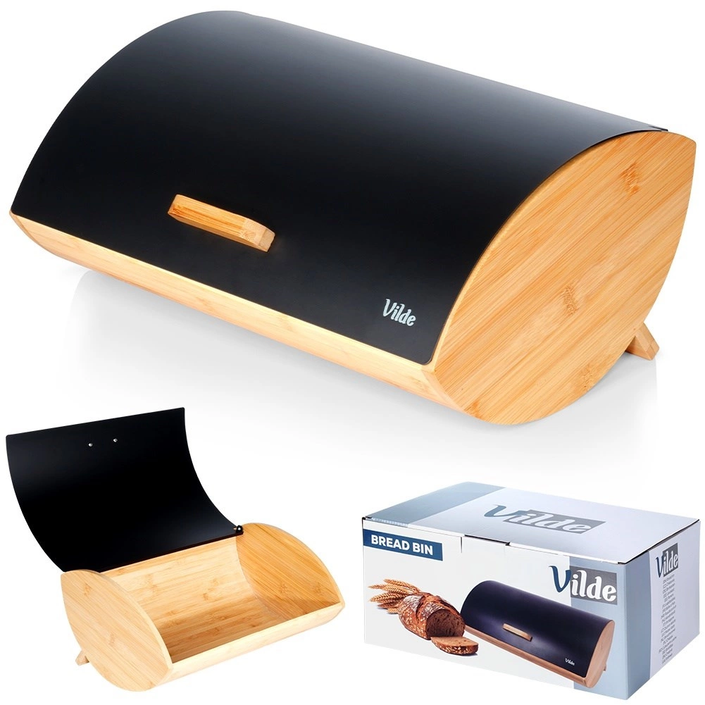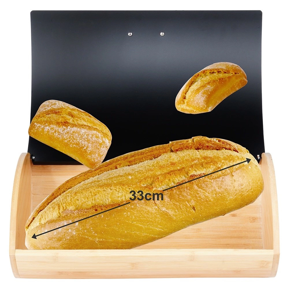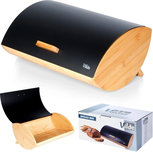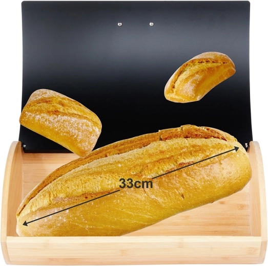 Praktický a stylový chlebník s rozměry 35,5 × 24,5 × 15,5 cm je ideální pro každodenní uchovávání chleba, housek i sladkého pečiva. Bambusové tělo je lehké a pevné, zatímco víko z práškově lakovaného kovu v matné černé barvě působí moderně a odolá každodennímu používání.